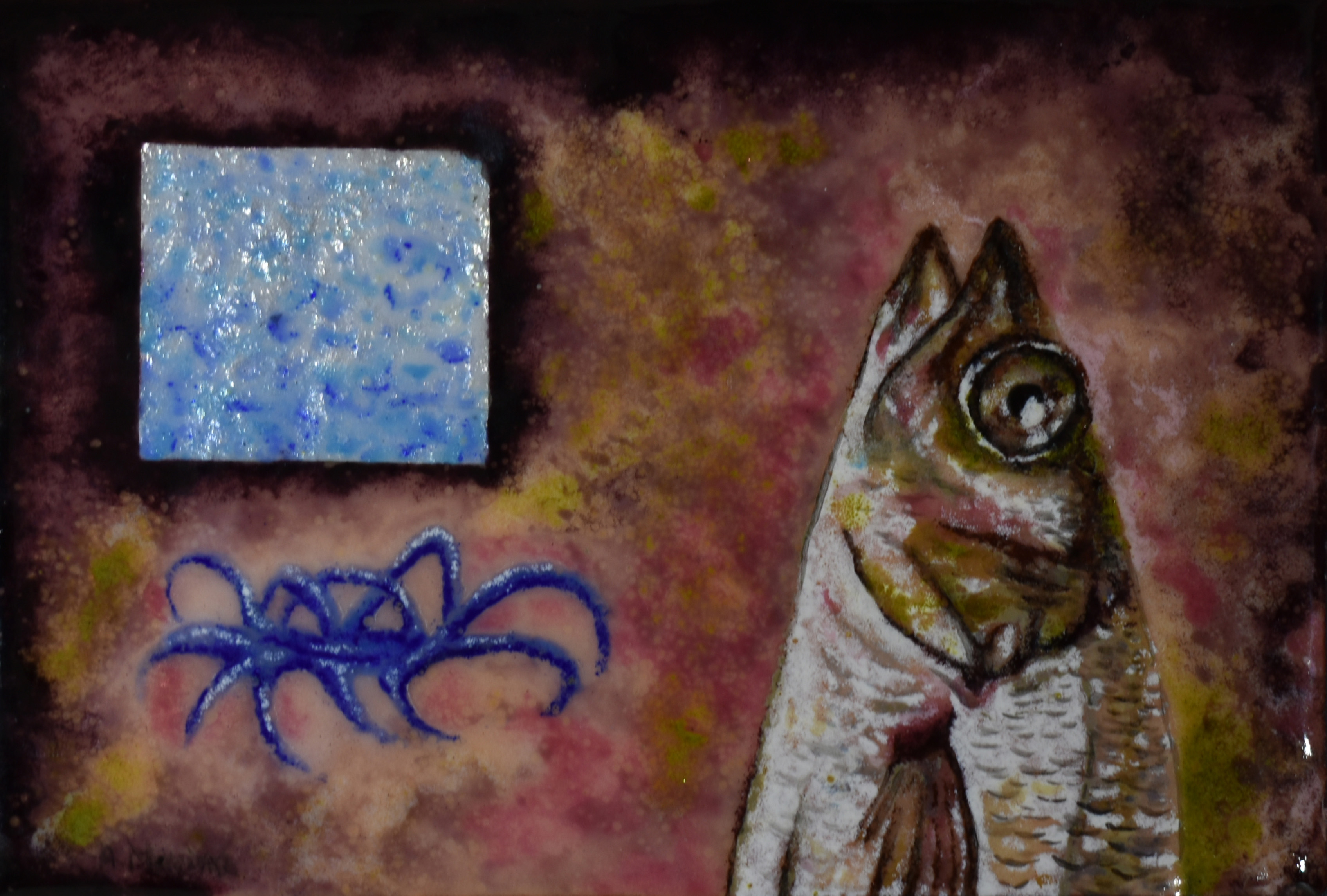 Esmalte con soporte de lámina de cobre y vidrio en polvo. Con tema surrealista en la que un pez trata de regresar al agua. El personaje principal es un pez, al fondo un cuadro azul dando a entender que es una ventana que da al mar.