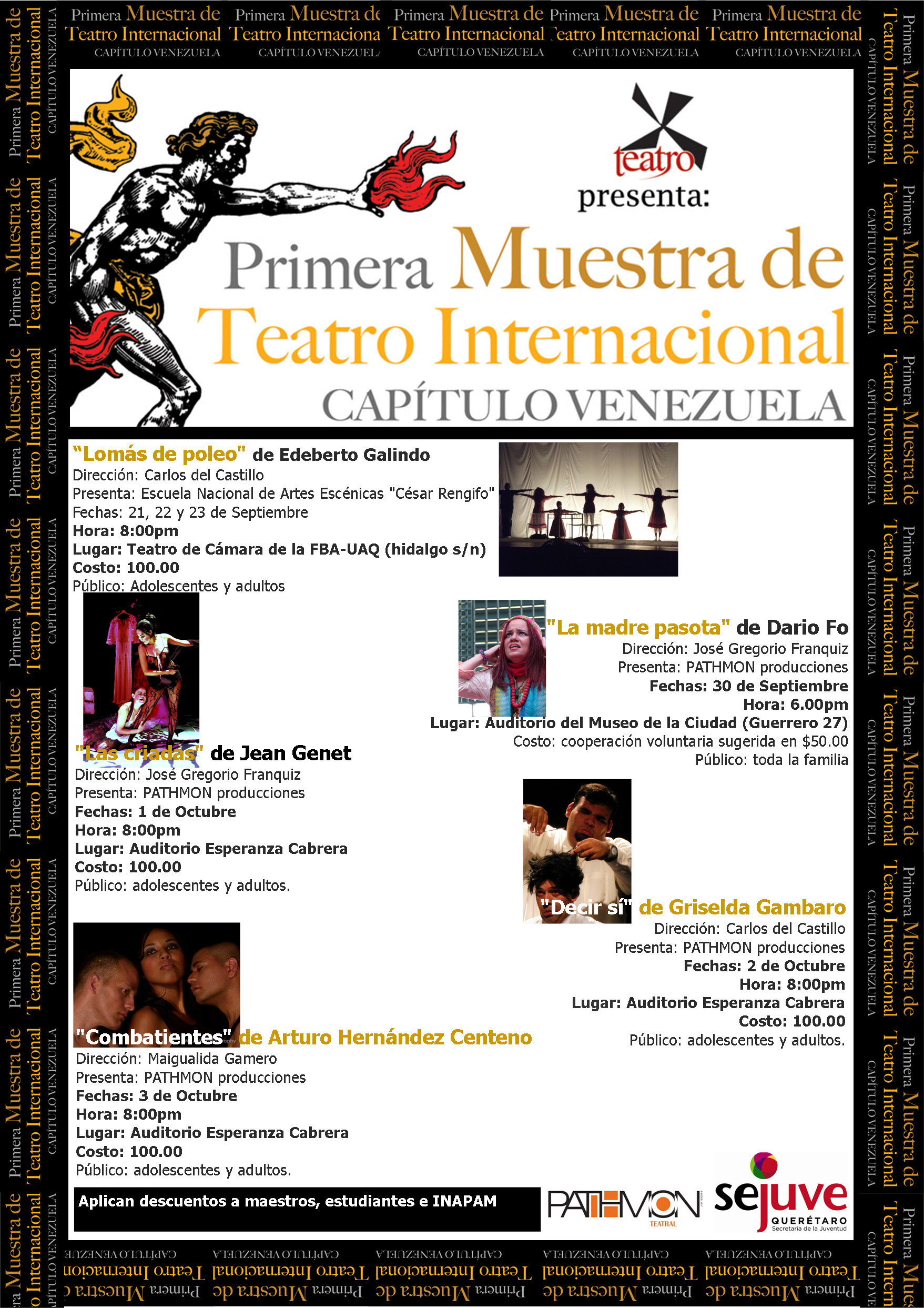 Pathmon Producciones, “Primera Muestra de Teatro Internacional Capítulo Venezuela,” ReDCA-Eventos, consulta 10 de marzo de 2026, http://redca.uaq.mx/eventos/items/show/193.