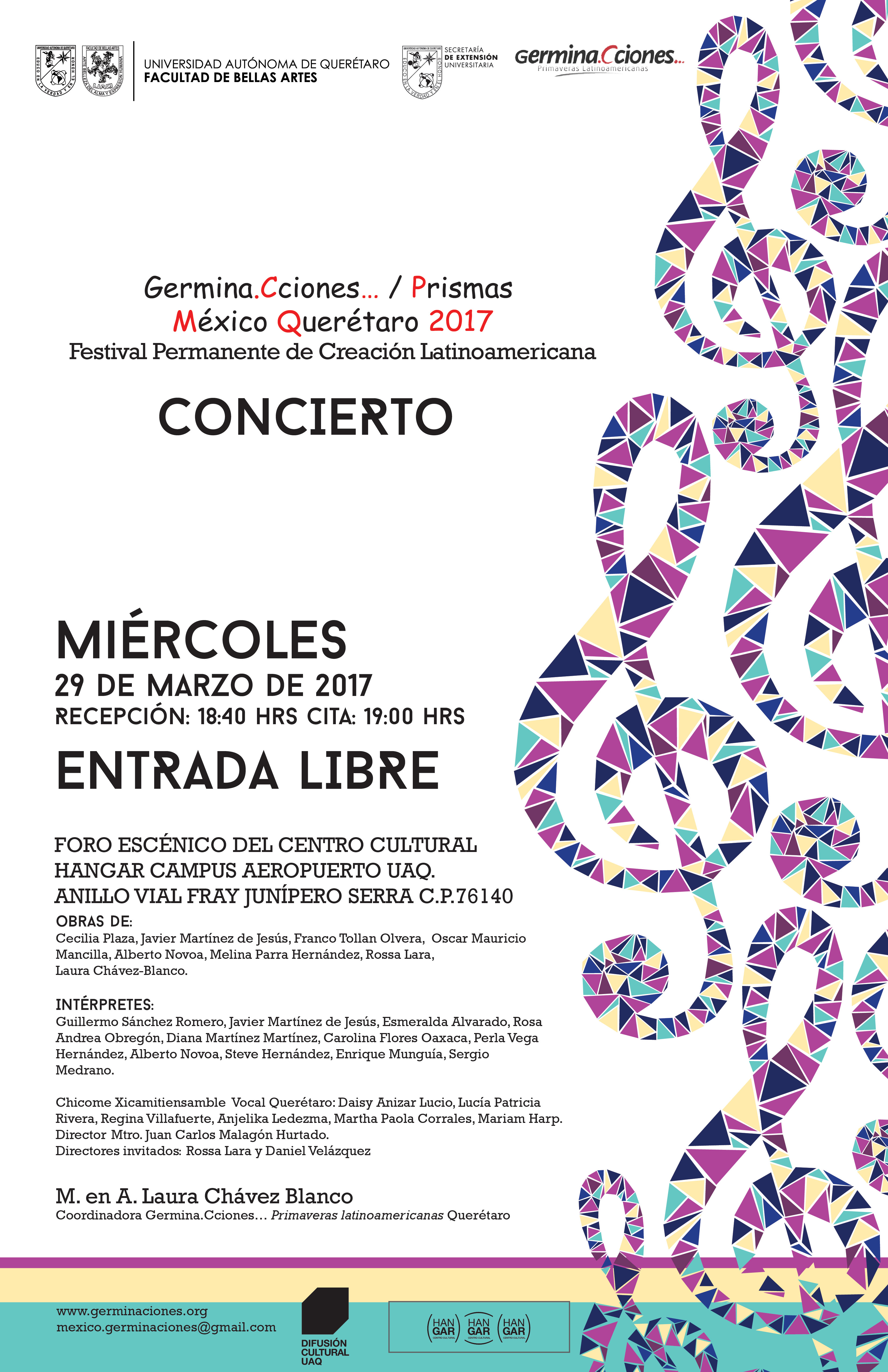 Concierto en el margen del Festival Permanente de creación latinoamericana, el miércoles 29 de marzo de 2017 a las 19 hrs. en el Foro escénico del Centro Cultural Hangar Campus aeropuerto UAQ