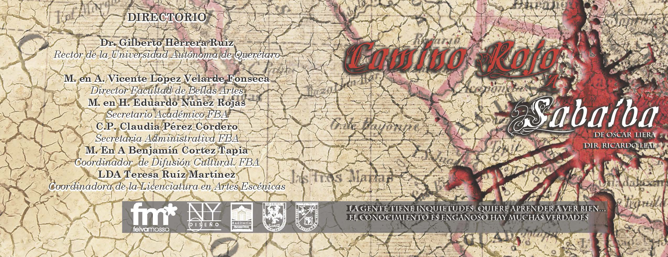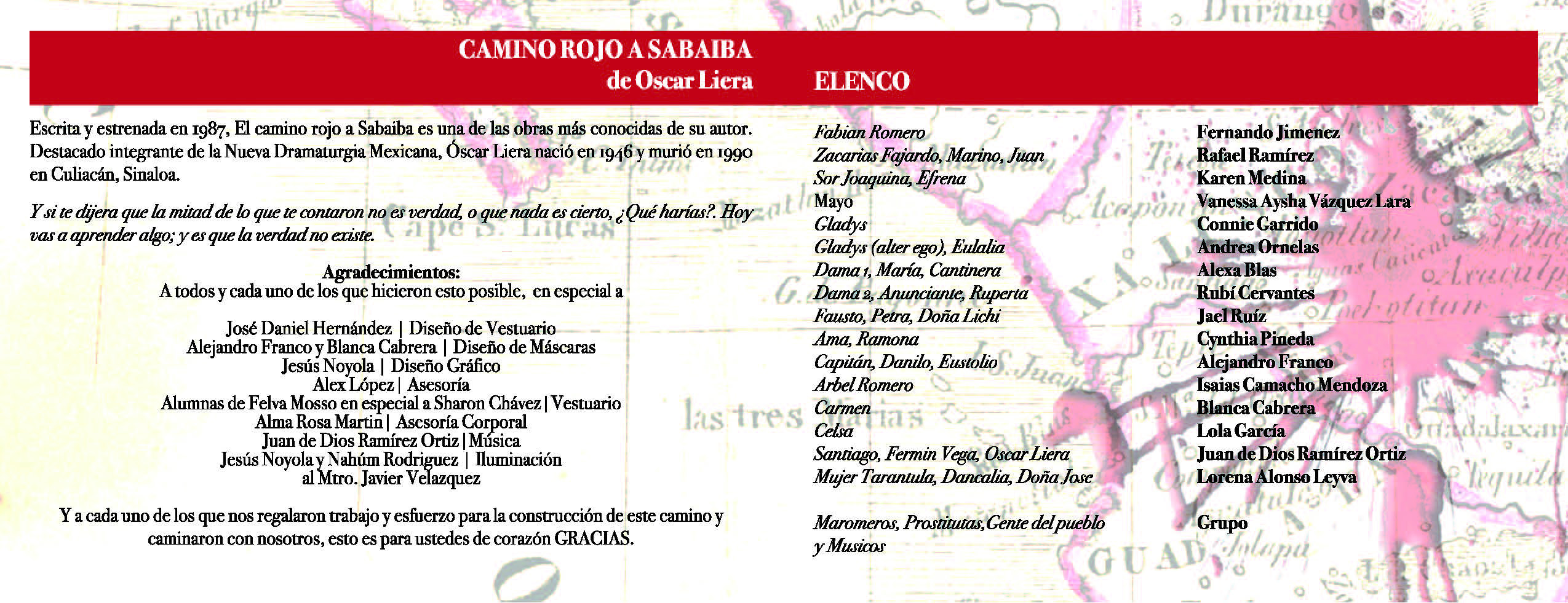 Folleto promocionando obra "Camino Rojo a Sabaiba" y poniendo créditos de los participantes.