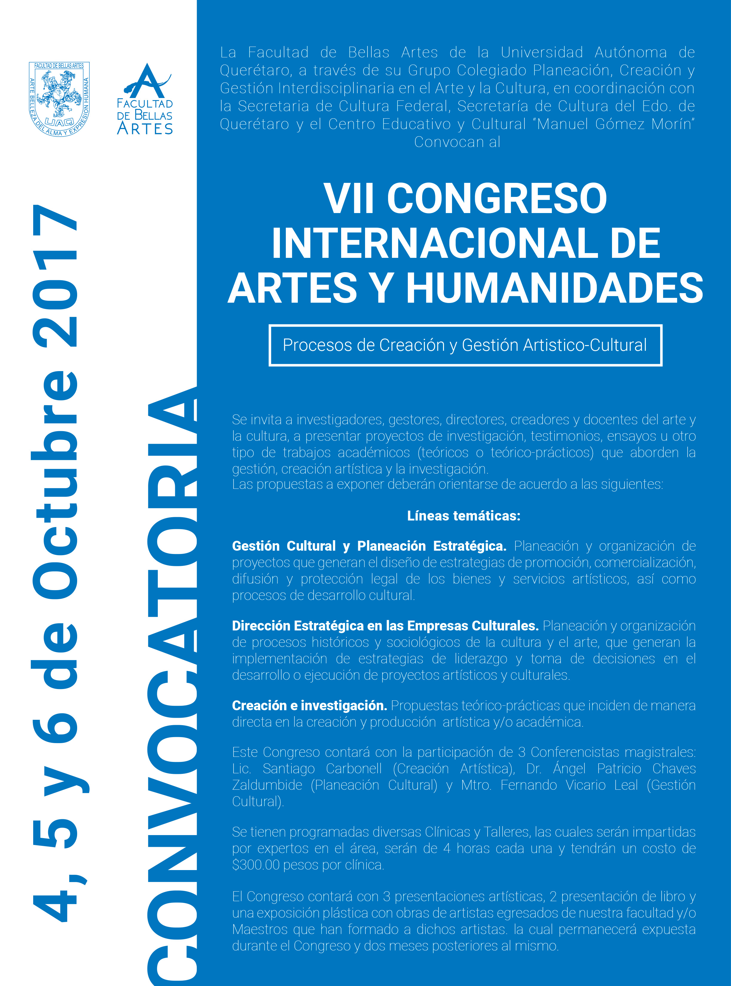 Convocatoria para participar en el VII Congreso Internacional de Artes y Humanidades de Procesos de Creación y Gestión Artístico-Cultural del 4 al 6 de Octubre de 2017
