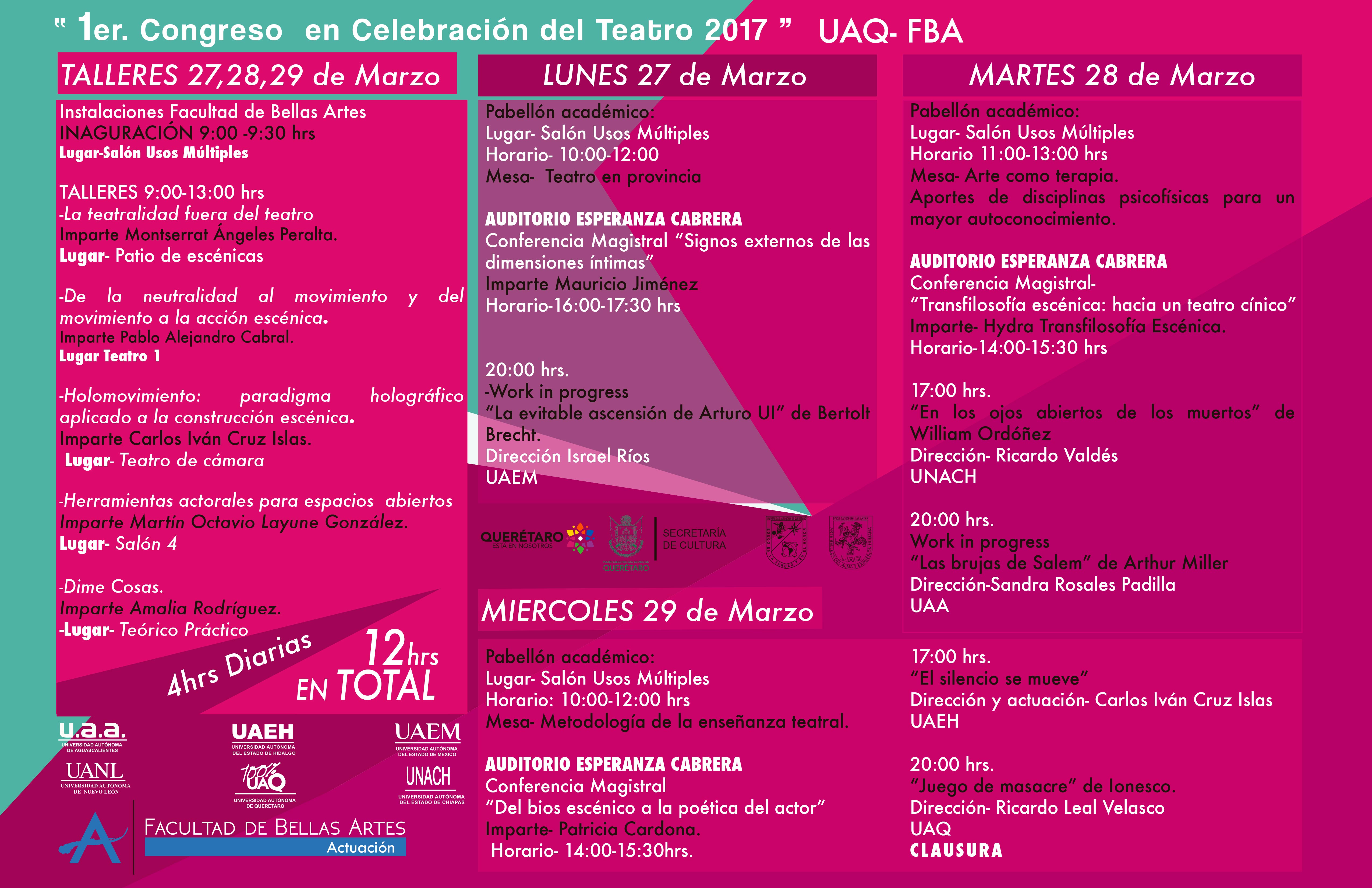 Programa de los Talleres y Conferencias dentro del 1er. Congreso en Celebración del Teatro en el Auditorio Esperanza Cabrera del 27 al 29 de marzo de 2017