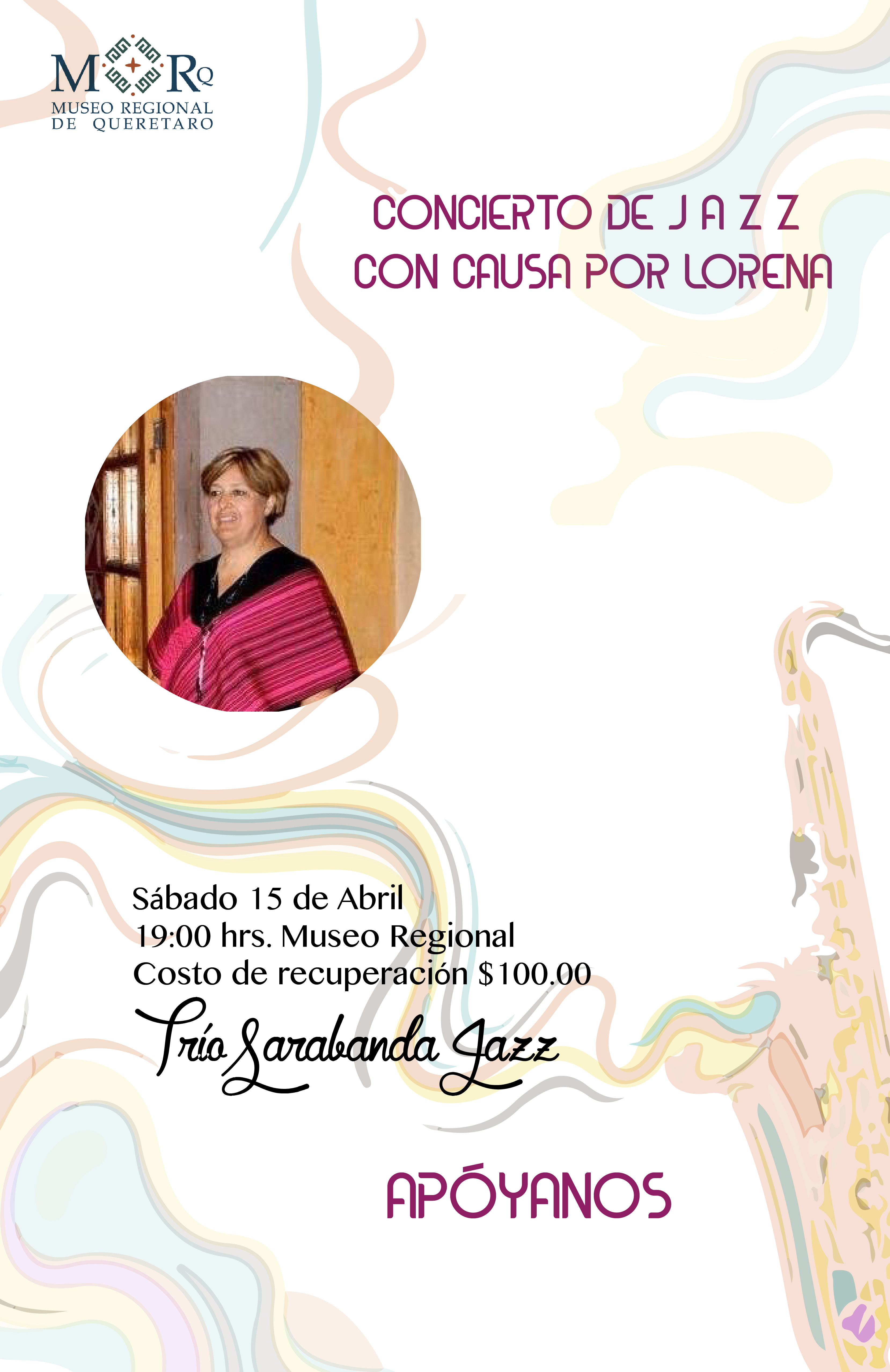 Cartel del concierto de Jazz con causa por Lorena el día sábado 15 de abril a las 19 hrs. en el Museo Regional con un costo de recuperación de $100