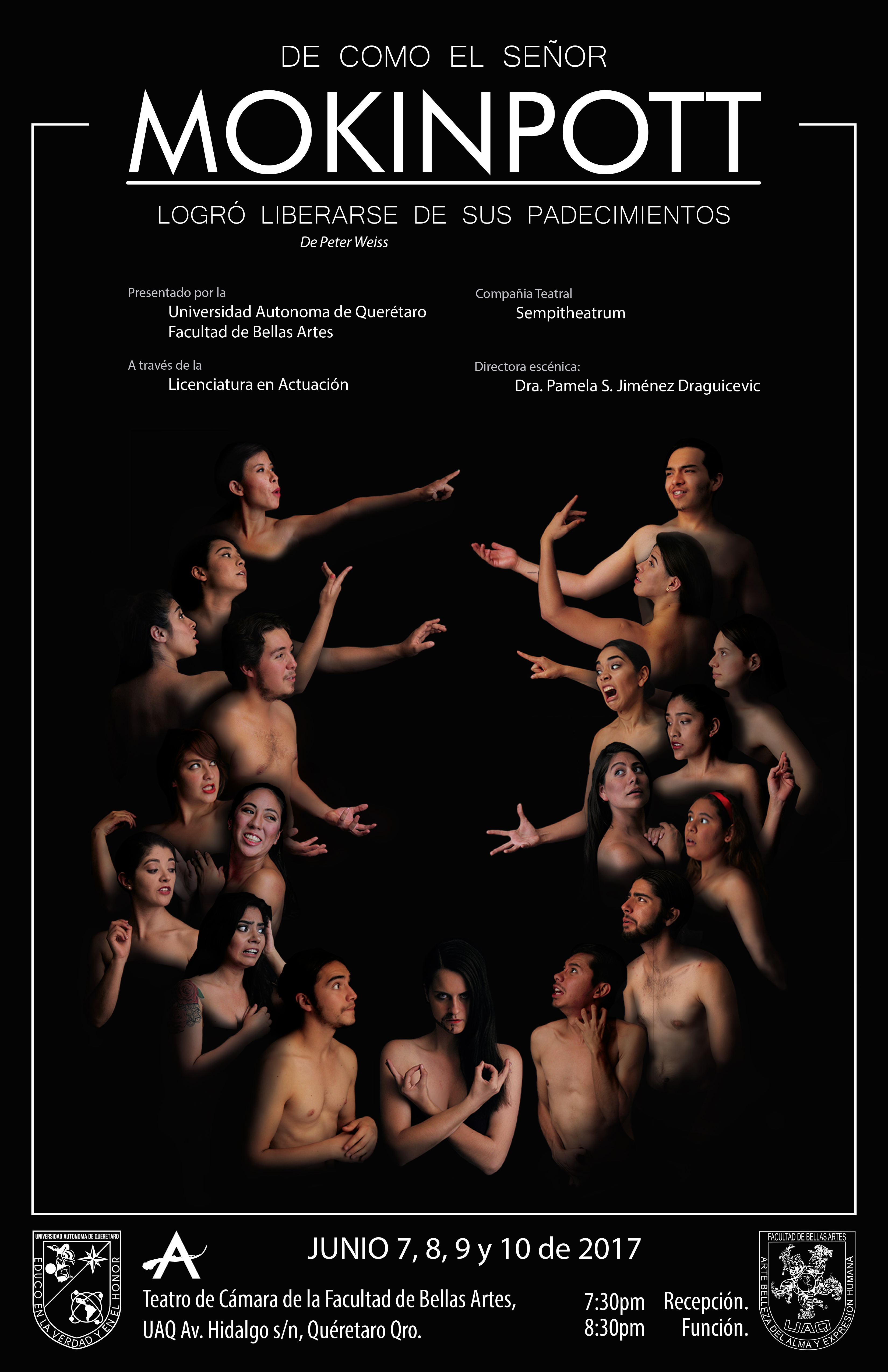 Obra de Peter Weiss, presentada por la FBA de la UAQ, a través de la Lic. en Actuación, con la dirección escénica de la Dra. Pamela S. Jiménez. Junio 7 al 10 de 2017 en el Teatro de cámara de la FBA a las 8:30 pm.