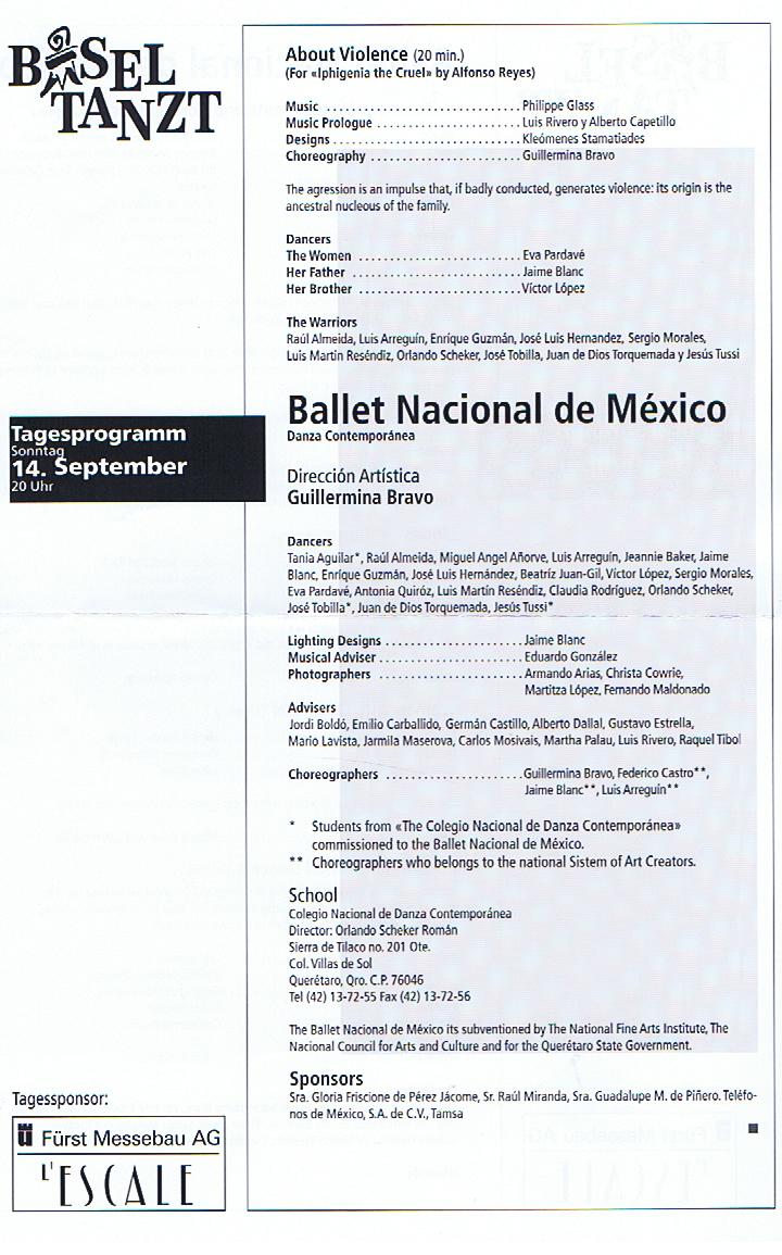 Programa en inglés, donde promociona las funciones del Ballet Nacional de México "About Violence".