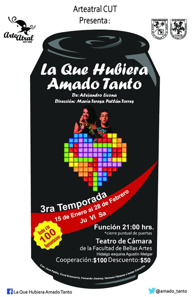La que hubiera amado tanto de Alejandro Licona con la dirección de María Teresa Patlán. 3ra temporada del 15 de enero al 28 de febrero. Función 21 hrs. en el Teatro de Cámara de la FBA. Rumbo a las 100 representaciones