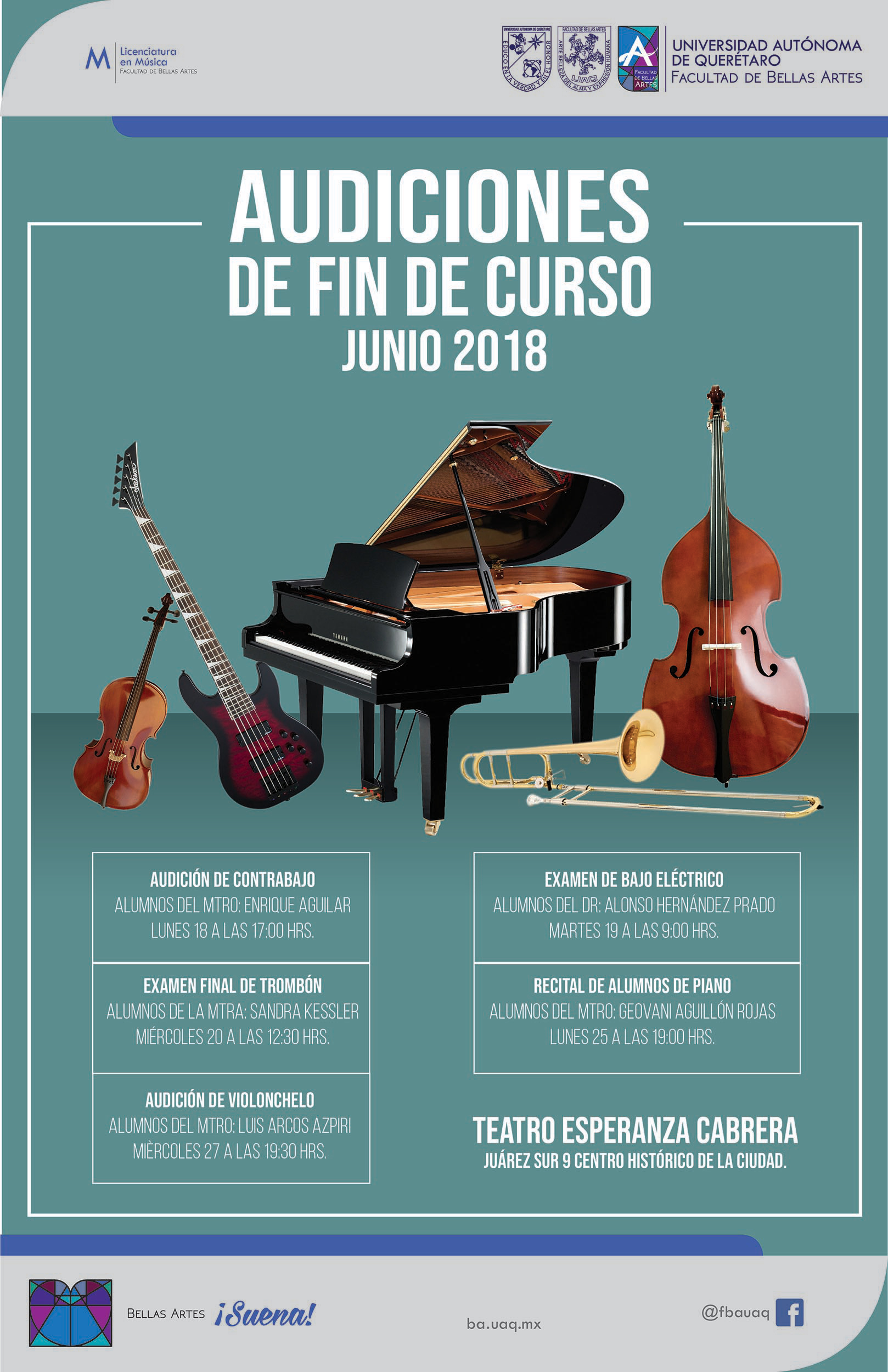 Audición de: Contrabajo, Examen final de trombón, Audición de violonchelo, Examen de bajo eléctrico y Recital de alumnos de piano en el Teatro Esperanza Cabrera