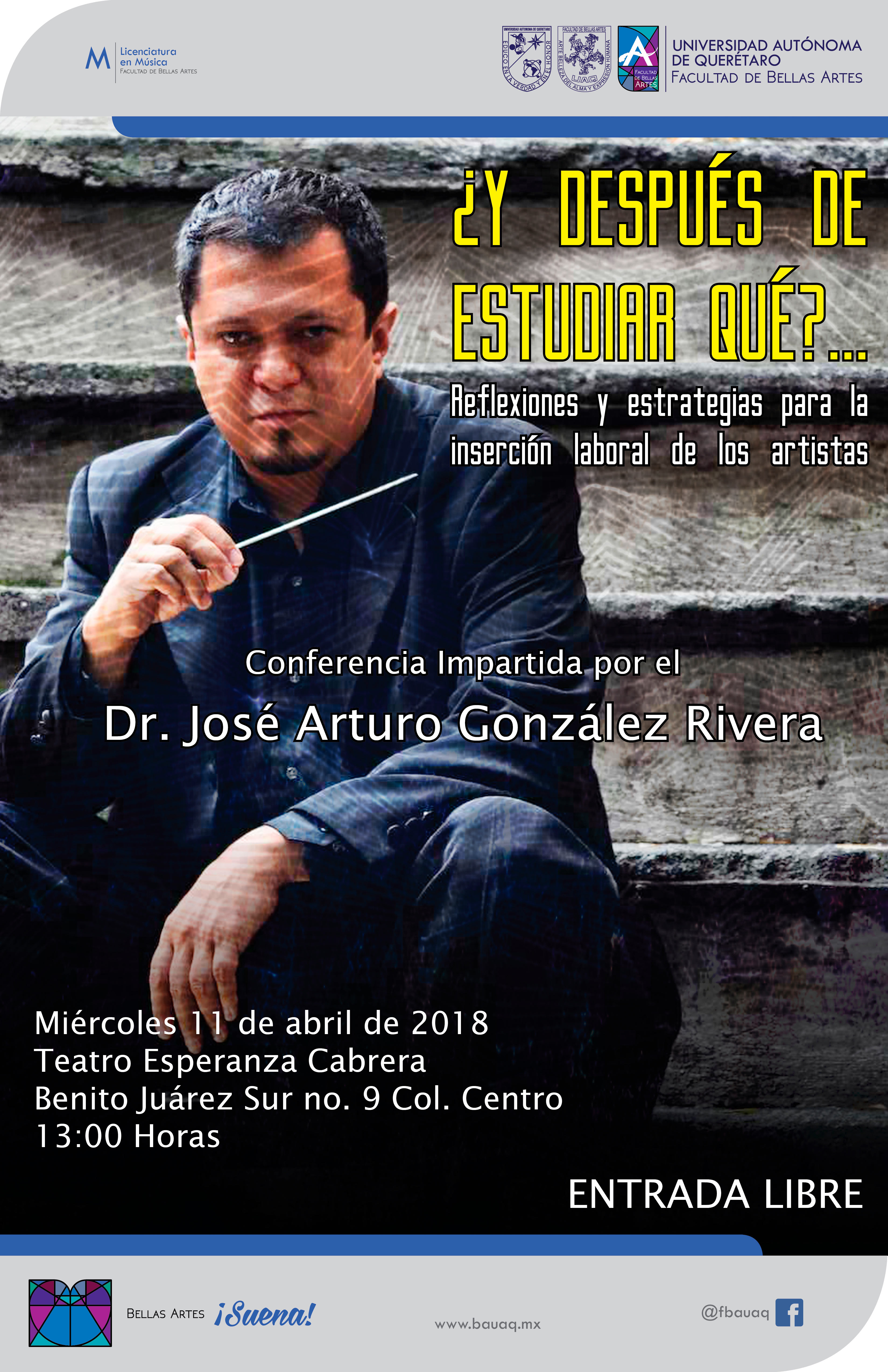 ¿Y después de estudiar qué?... Reflexiones y estrategias para la inserción laboral de los artistas. Conferencia impartida por el Dr. José Arturo González Rivera. Miércoles 11 de abril de 2018 en el Teatro Esperanza Cabrera a las 13 hrs.