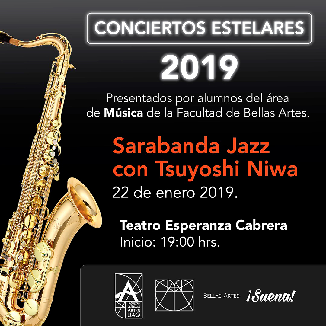 Conciertos presentados por alumnos de Música con: Música Popular contemporánea, Música Académica y Sarabanda Jazz con Tsuyoshi Niwa. 22 de enero a las 19 hrs. en el Teatro Esperanza Cabrera