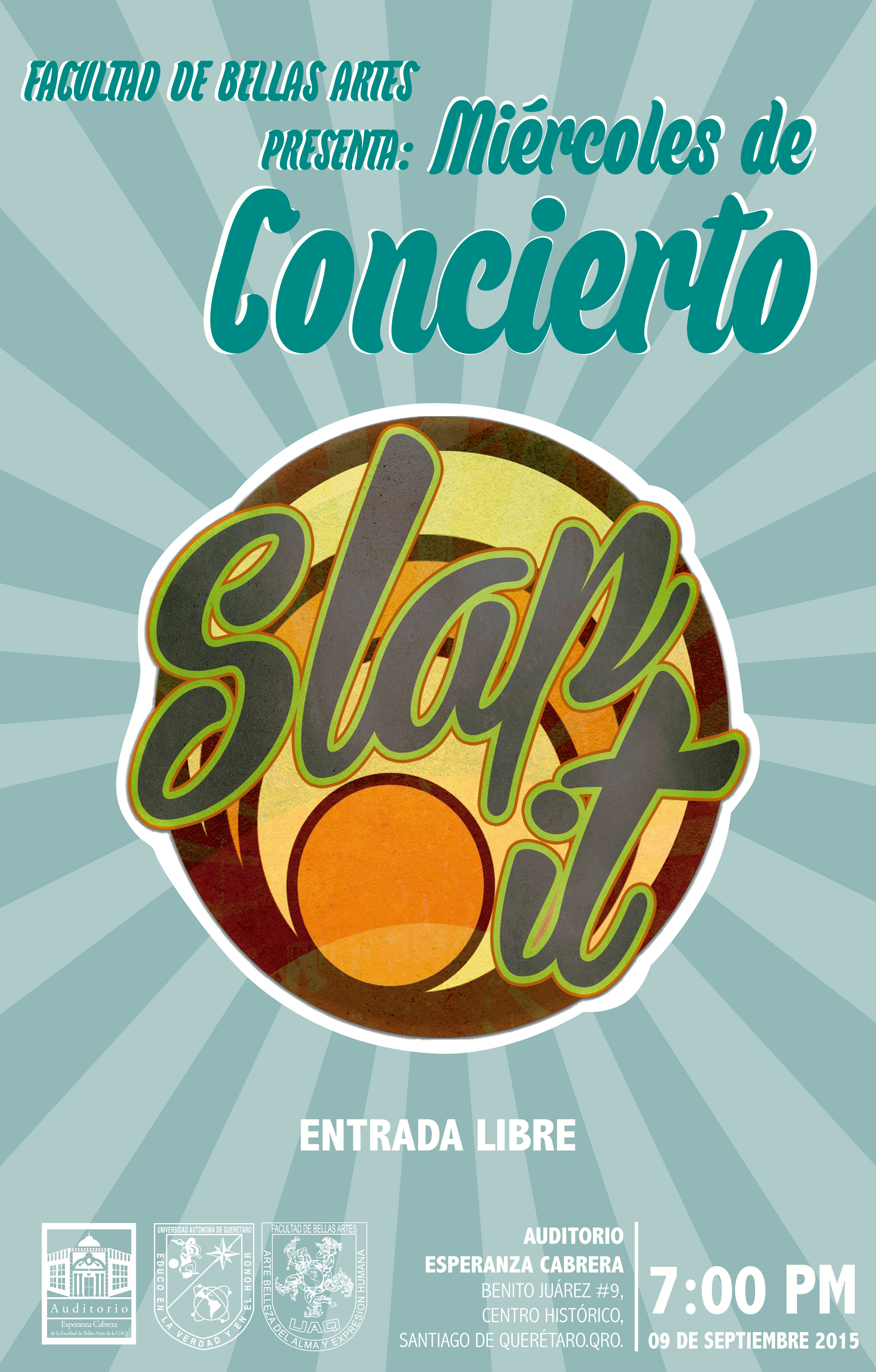 Miércoles de concierto presenta: Slap It. Entrada libre. Auditorio Esperanza Cabrera. 9 de septiembre de 2015 a las 19 hrs.