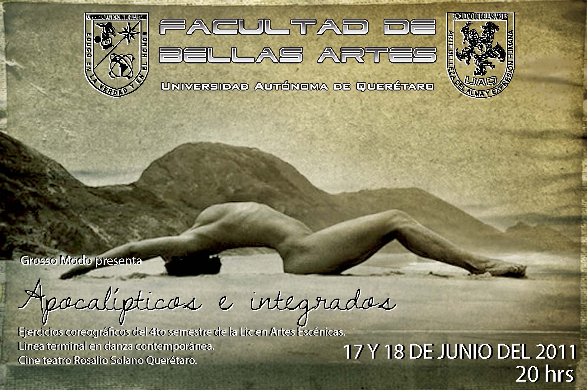 Grosso Modo presenta: "apocalípticos e integrados". Ejercicios coreográficos del 4to semestre de la Lic en Artes Escénicas. Línea terminal en danza contemporánea. Cine teatro Rosalío Solano Querétaro. 17 y 18 de junio 2011. 20 hrs.