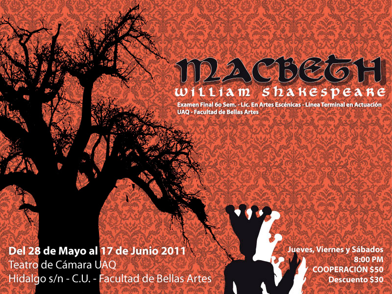 Macbeth. William Shakespeare. Examen final 6to semestre-Lic. en Artes escénicas- Línea terminal en Actuación- UAQ- FBA. Del 28 de mayo al 17 de junio de 2011. Teatro de cámara de la UAQ. Jueves, viernes y sábados. 8:00pm. Cooperación $50. Descuento $30