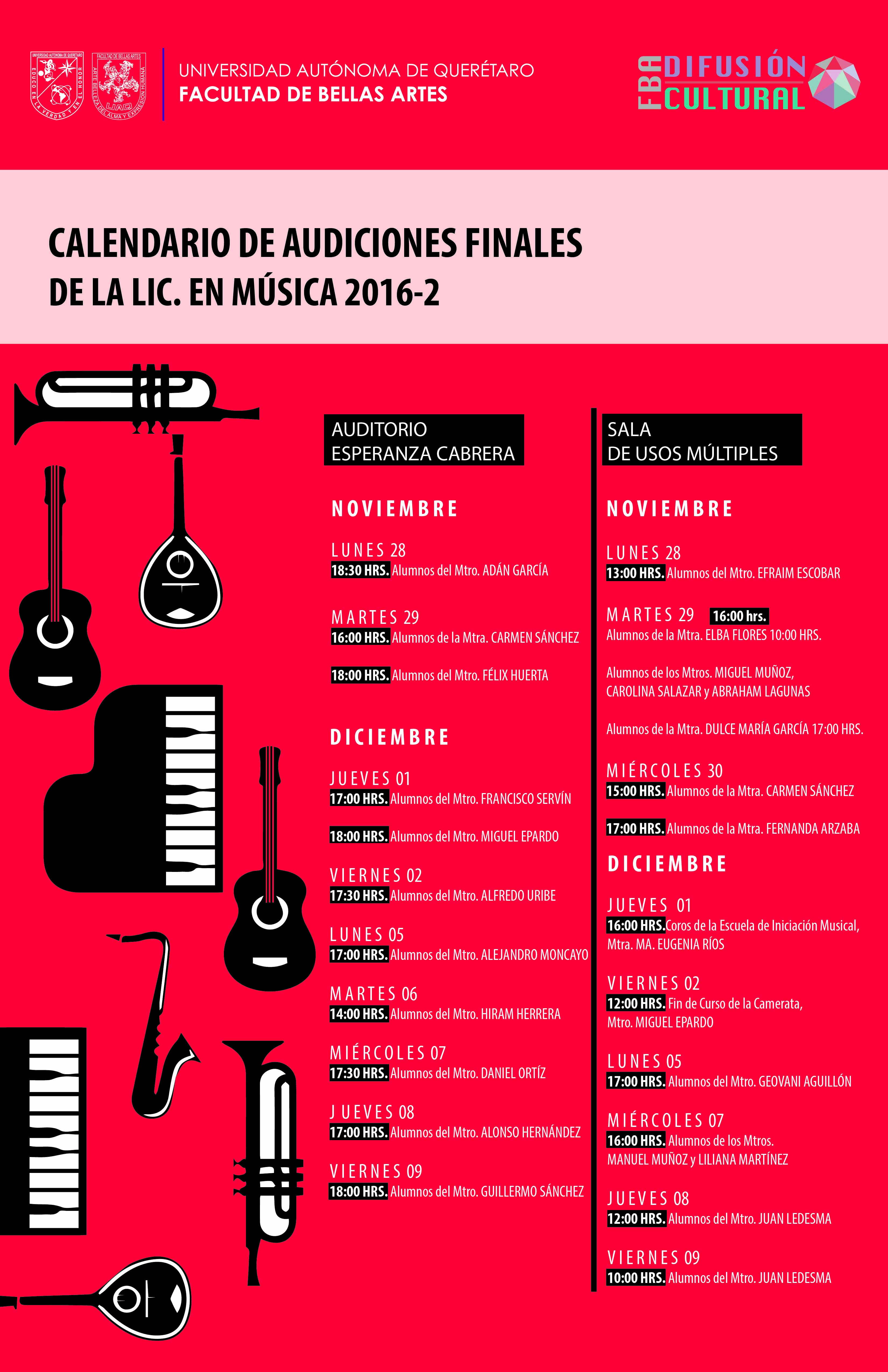 FBA, “Calendario Audiciones Música 2016 – 2,” ReDCA-Eventos, consulta 9 de marzo de 2026, http://redca.uaq.mx/eventos/items/show/68.
