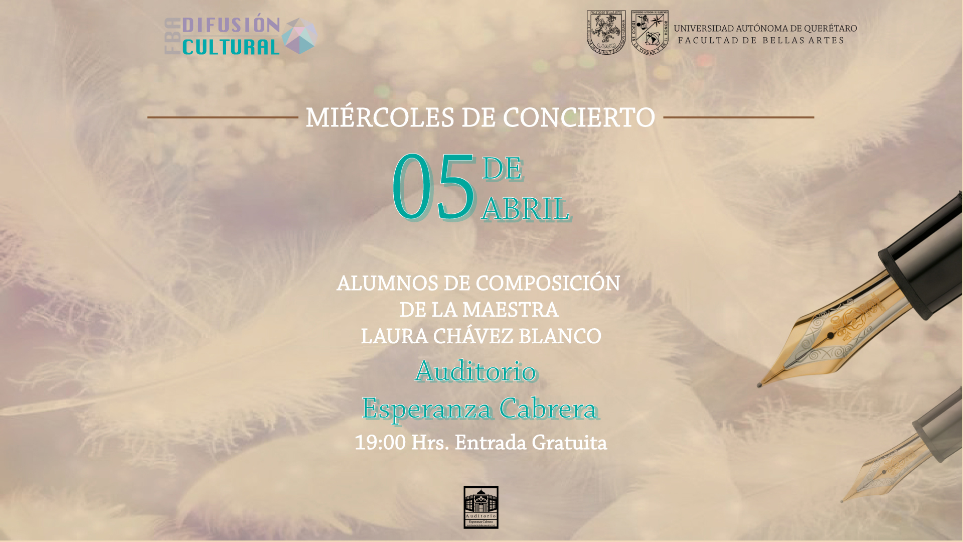 FBA-Auditorio Esperanza Cabrera: 05 de abril, 19:00hrs. Entrada gratuita