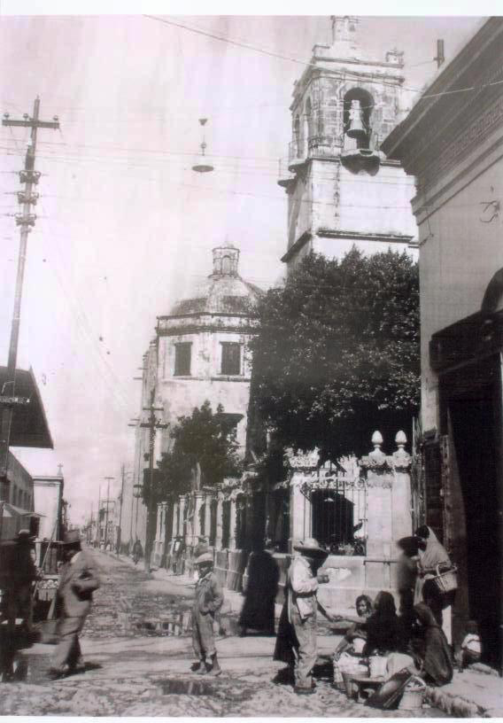 En el lado izquierdo de la fotografía hay una persona caminando hacia un tranvía. Del lado derecho, en una esquina se encuentra el Templo del Carmen y frente a ella una casa, también se puede apreciar a personas sentadas en la baqueta y otras paradas enfrente de ellas.