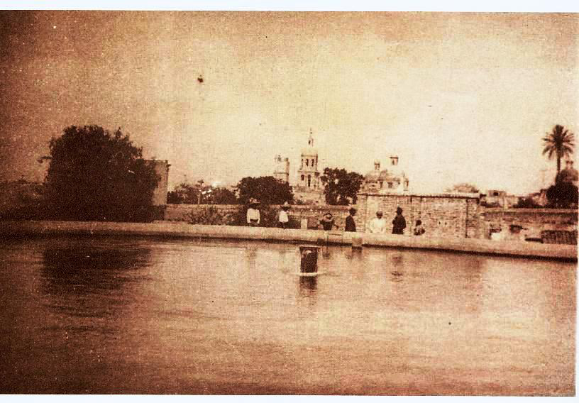 En primer plano un tanque de agua y sobre este unas personas recargadas. Al fondo un muro, del lado izquierdo un árbol, atrás una iglesia con sus cúpulas y palmeras.