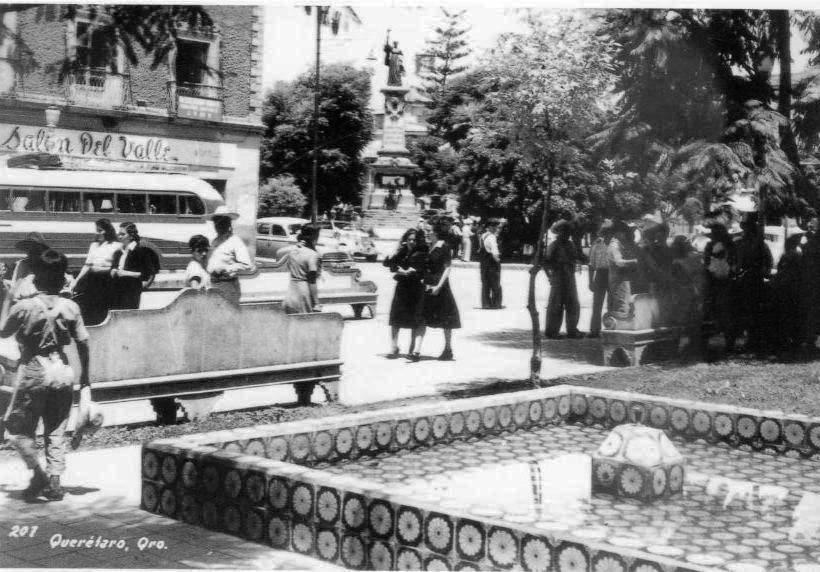 En primer plano una fuente con azulejo, en frente una persona de espaldas y a lado una banca de concreto. Del lado derecho de la fotografía árboles y personas alrededor de otra banca, cinco mujeres de vestido caminando, dos personas abrazadas. Enfrente hacia el fondo una estatua y a lado un camión que cubre el salón del valle.