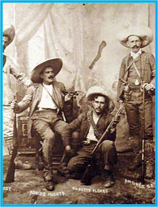 Del lado izquierdo de la fotografía un hombre parado con un sombrero (no sale completo); le sigue uno otro sentado sombre una silla, sostiene una escopeta con la mano izquierda y está volteando hacia la derecha; en medio hay un hombre en cuclillas, recarga su mano sobre su pierna izquierda, en la derecha sostiene una escopeta; y el último hombre está parado viendo hacia el frente, sosteniendo un arma con la mano derecha.