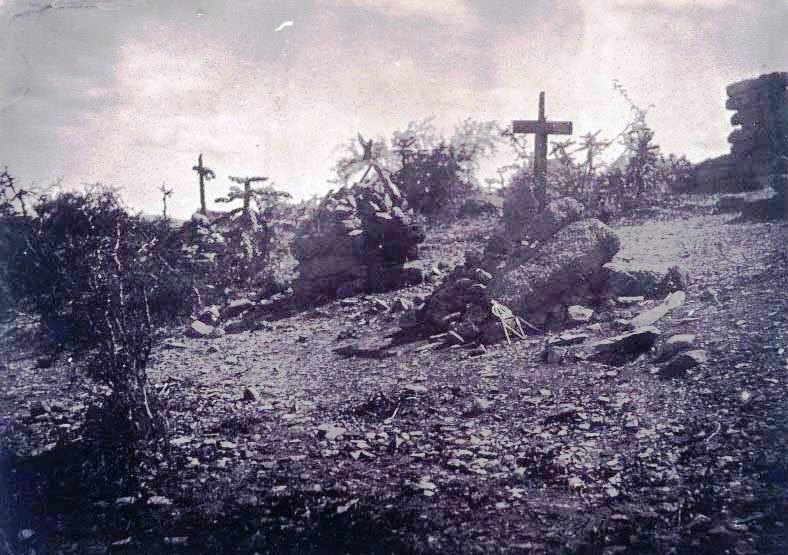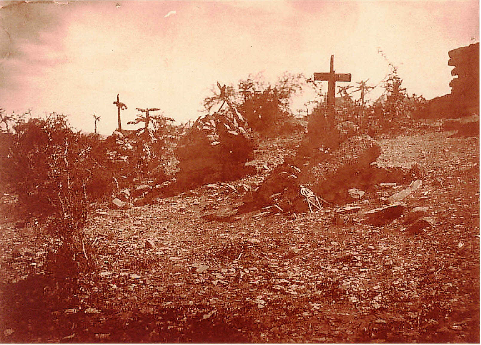 Un campo abierto ligeramente inclinado, con un arbusto del lado izquierdo, en medio se pueden observar tres bultos de piedras con una cruz sobre cada uno. Al fondo más arbustos, plantas, árboles y del lado derecho un muro de piedra.