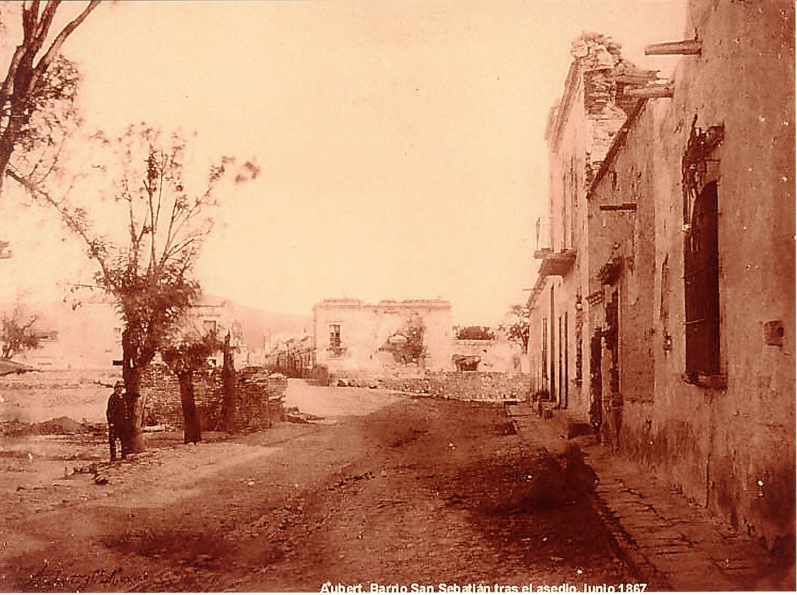 Barrio de San Sebastián tras el asedio. Una calle de tierra; del lado izquierdo unos árboles y una persona parada; del lado derecho y al fondo unas edificaciones.