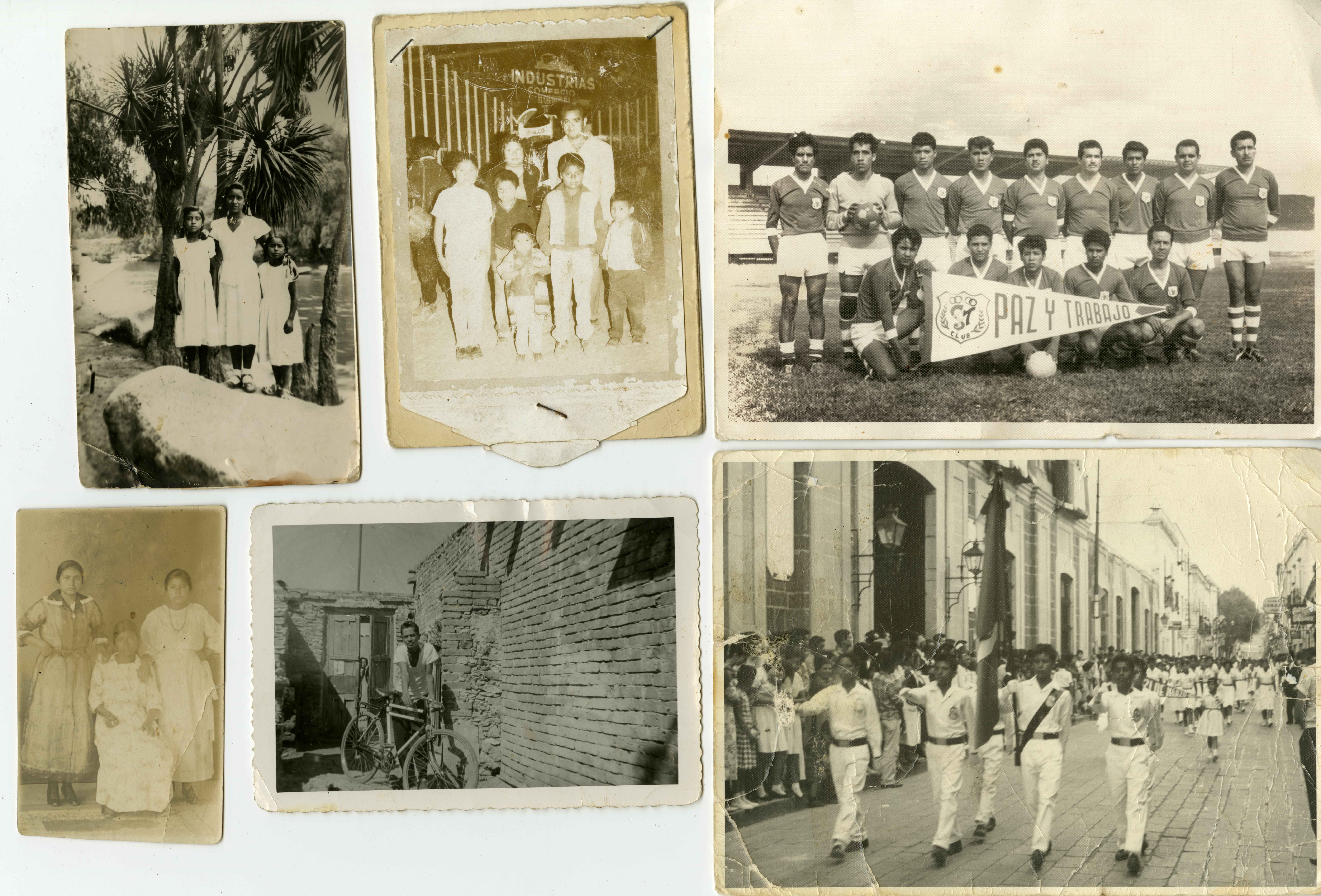 Arriba a la izquierda, dos niñas y una mujer; arriba en el centro, cinco niños y una pareja; arriba a la derecha, un equipo de futbol. Abajo a la izquierda, tres mujeres; abajo centro, un hombre con bicicleta; abajo a la derecha, un desfile.