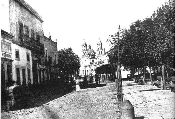 Foto tomada desde la esquina de calle Molino con Juárez. De fondo se ve el Templo de la Congregación. Al costado derecho se ve parte de lo que actualmente es Jardín Zenea.