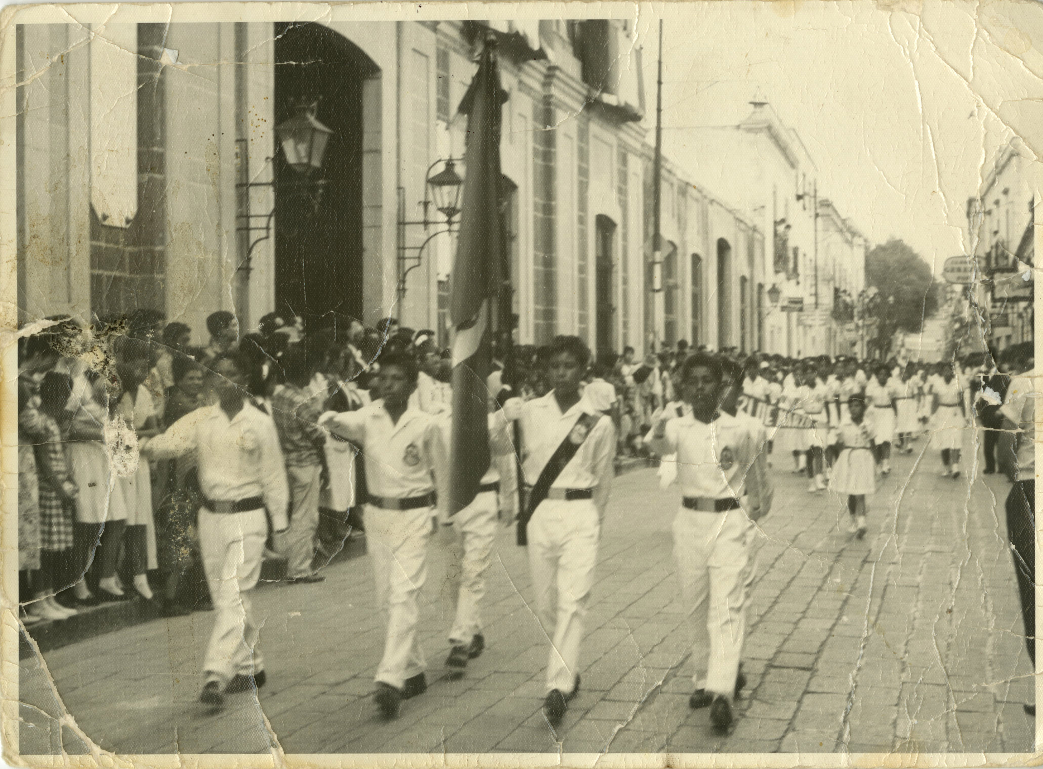En primer plano se encuentra una escolta formada por niños, atrás un conglomerado de niños marchando y a los costados personas viendo el desfile entre la calle.