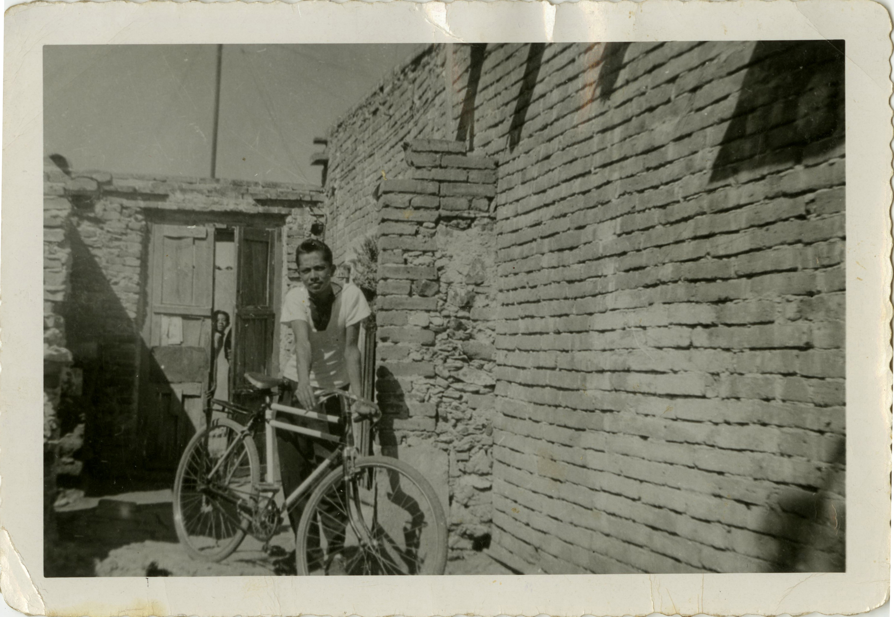 Un hombre con una bicicleta en el patio de una casa con paredes de ladrillo, al fondo una puerta entre abierta con una persona asomada.