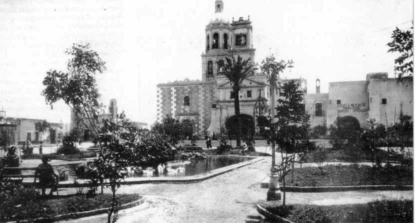 Antiguo patio del Templo de la Cruz de Querétaro, con lago y palmeras