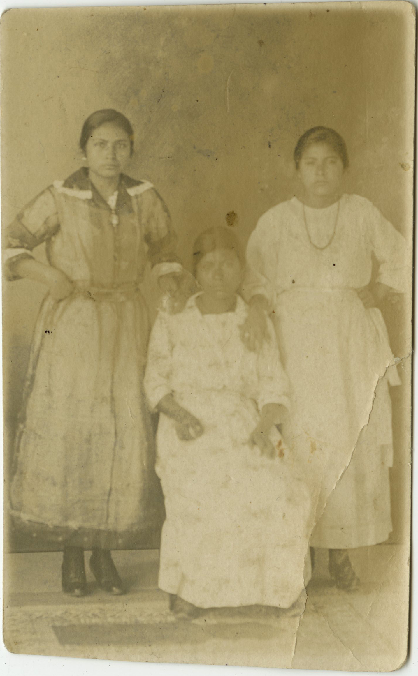 Dos mujeres paradas y en medio una mujer sentada, las tres tienen vestidos largos hasta el tobillo y cabello agarrado hacia atrás
