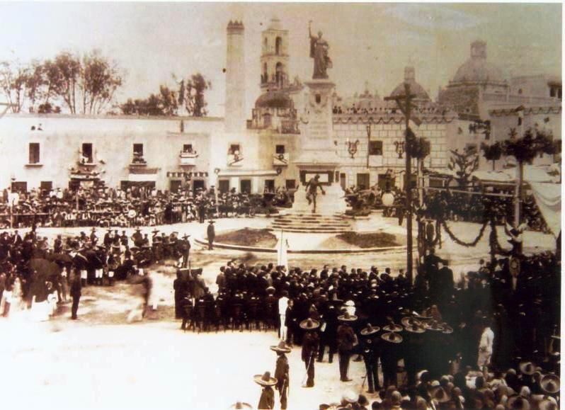 Gente reunida alrededor del jardín donde está el monumento a la corregidora