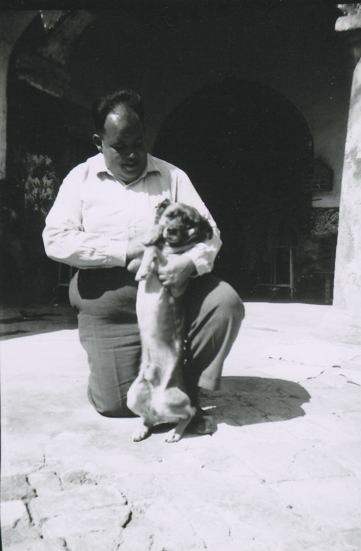 Un hombre arrodillado, mirando hacia abajo, agarrando a su perro; el perro parado en dos patas, recargado sobre la pierna del hombre. El fondo es el patio de una casa.