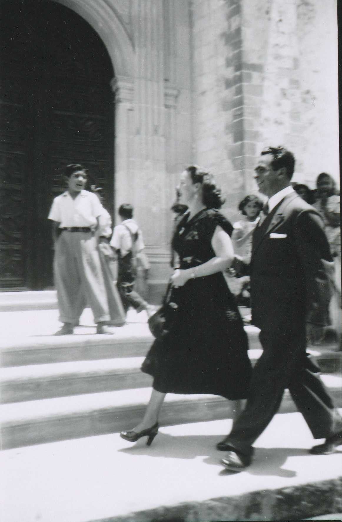 Un hombre de traje caminando con una mujer, la cual es el punto central de la fotografía. La mujer viste un vestido hasta la pantorrilla, zapatos de tacón y un bolso negro. En el fondo se puede observar un niño viéndolos fijamente, más personas y la entrada de una iglesia.