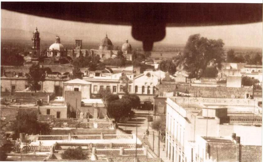 Panorámica de Querétaro, donde se ven edificios, el cine Goya y un templo.