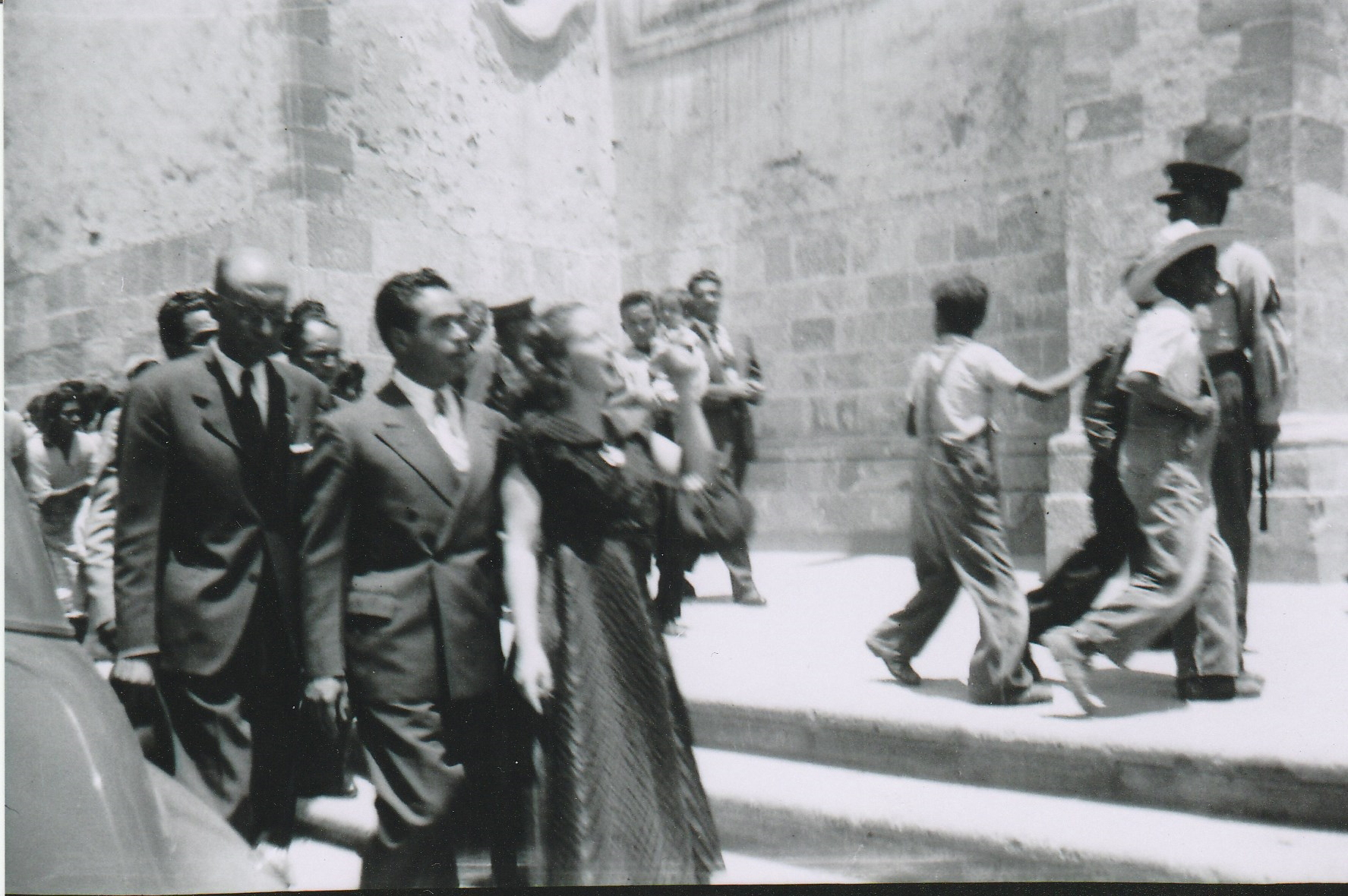 En primer plano una pareja, el hombre con traje y la mujer con un vestido largo; atrás de ellos un hombre con traje y lentes; Y más atrás un grupo de personas caminando. En el fondo cerca de la iglesia un hombre cargando a un niño, adelante dos niños caminando y un hombre con uniforme.