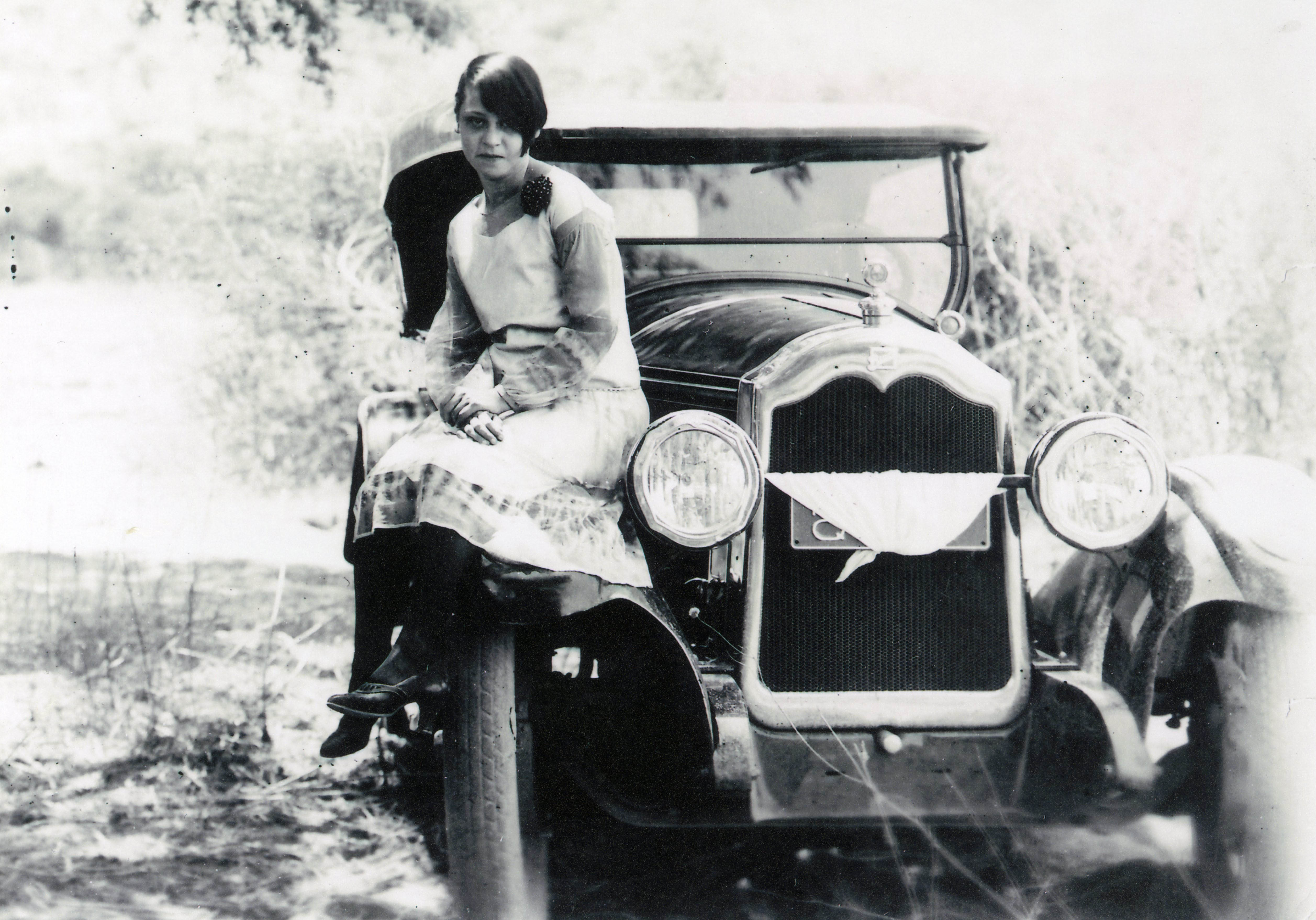 Retrato de una mujer sentada arriba de un automóvil, en un campo abierto con árboles y pasto.