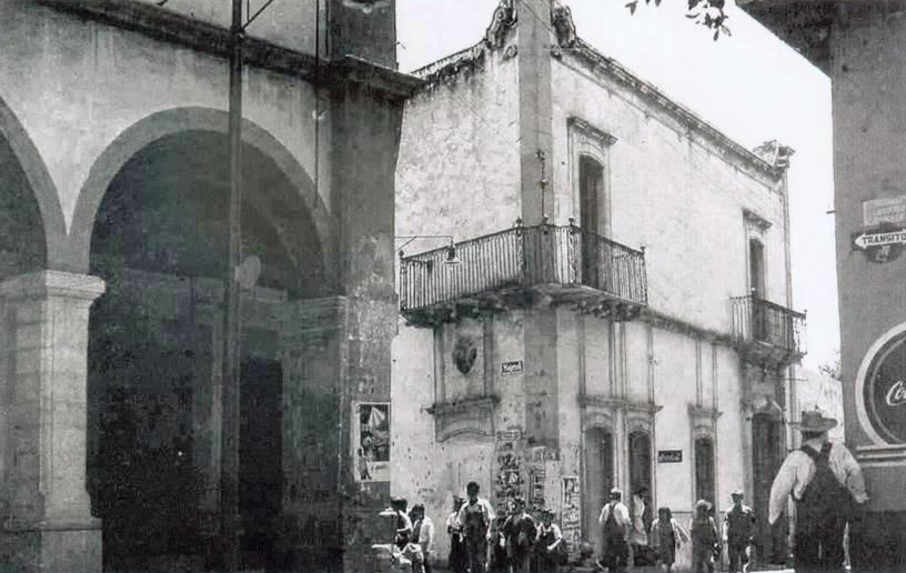 Edificio de la actual Secretaria de Educación del Edo. de Querétaro. Muchas personas pasan frente al edificio. Algunos carteles pegados a las columnas.