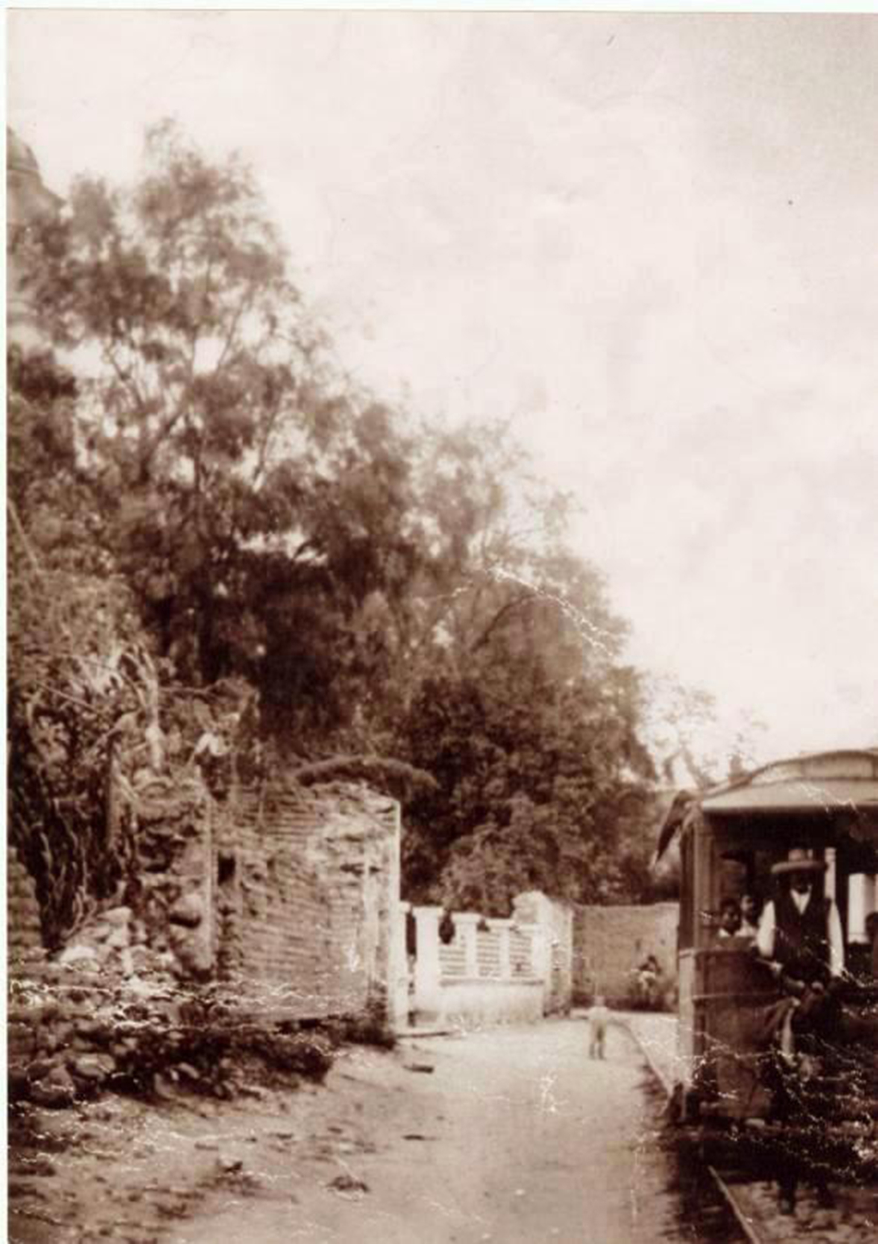 Del lado derecho unas vías, sobre él un tranvía tirado por mulas; en medio un pasillo de tierra; del lado izquierdo muros y árboles grandes.
