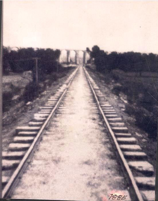 Unas vías de tren en medio de árboles y postes, al fondo se pueden ver el acueducto.