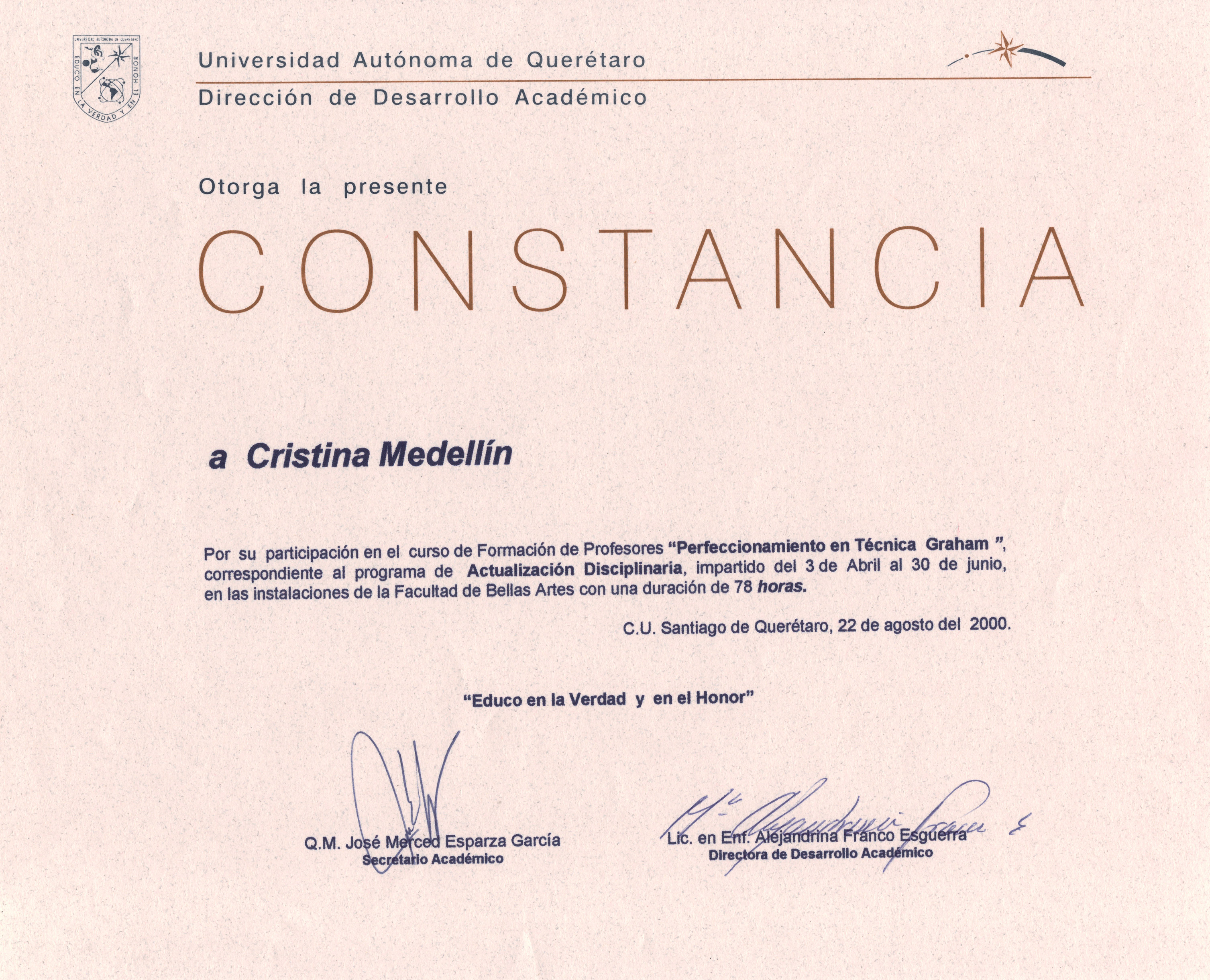Cristina Medellín, “Perfeccionamiento en Técnica Graham,” ReDCA-Grosso Modo, consulta 9 de marzo de 2026, http://redca.uaq.mx/grosso-modo/items/show/406.