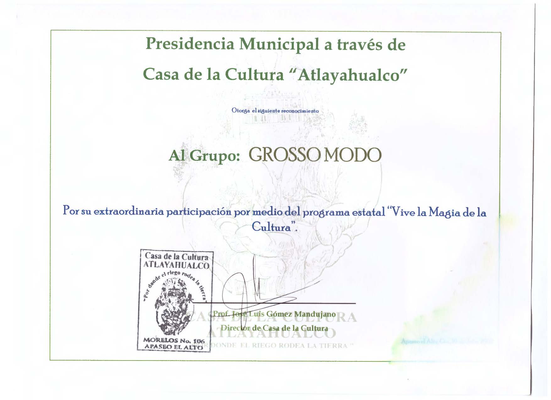 Constancia de participación de la casa de cultura de Atlayahualco, por participar en el evento cultural "La Magia de la Cultura"