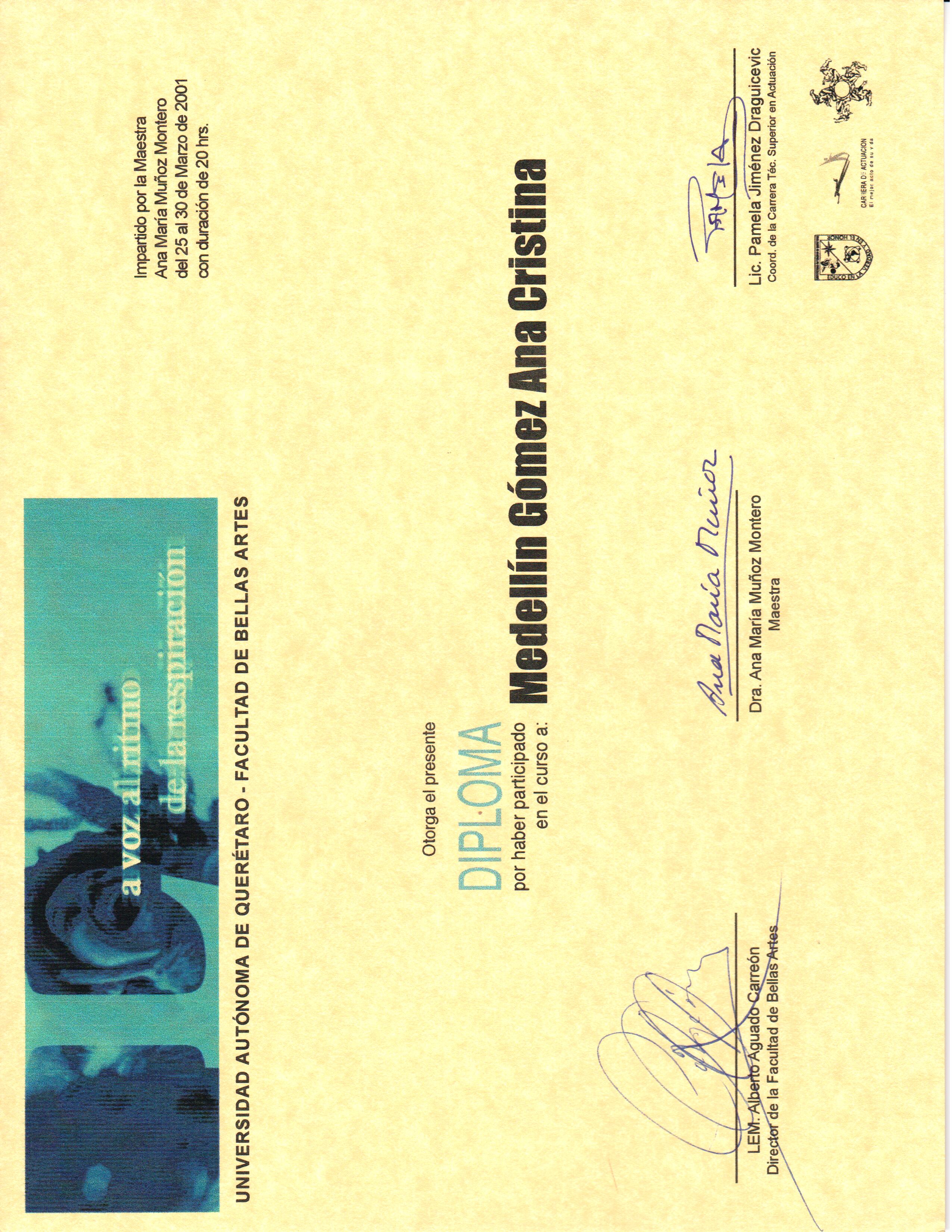 Diploma para Ana Cristina Medellín Gómez por haber impartido el curso de "A voz al ritmo de la respiración" en la Facultad de Bellas Artes de la Universidad Autónoma de Querétaro.