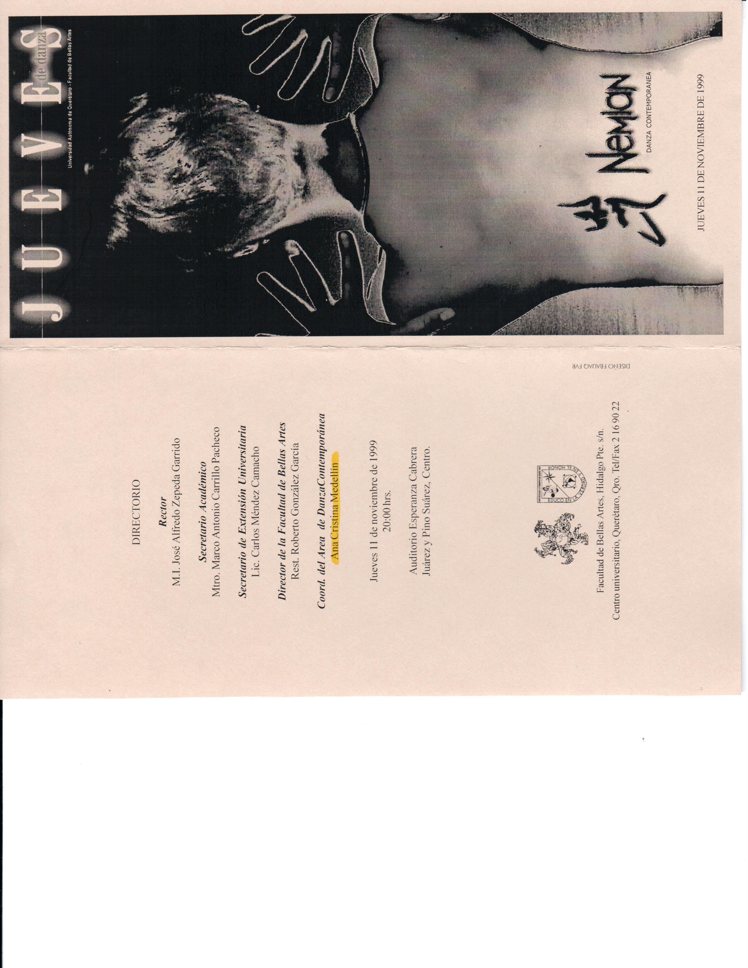 Portada y Contraportada de folleto del evento de jueves de danza con la obra Nemian dirigida por Ana Cristina Medellín.