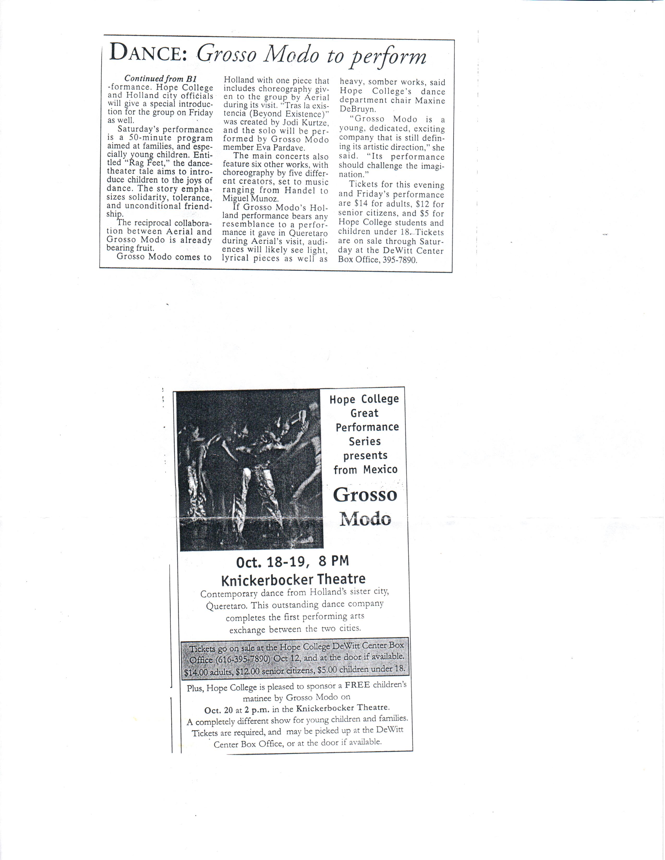 Nota periodística en donde se promociona función de danza de Grosso Modo en Estados Unidos.