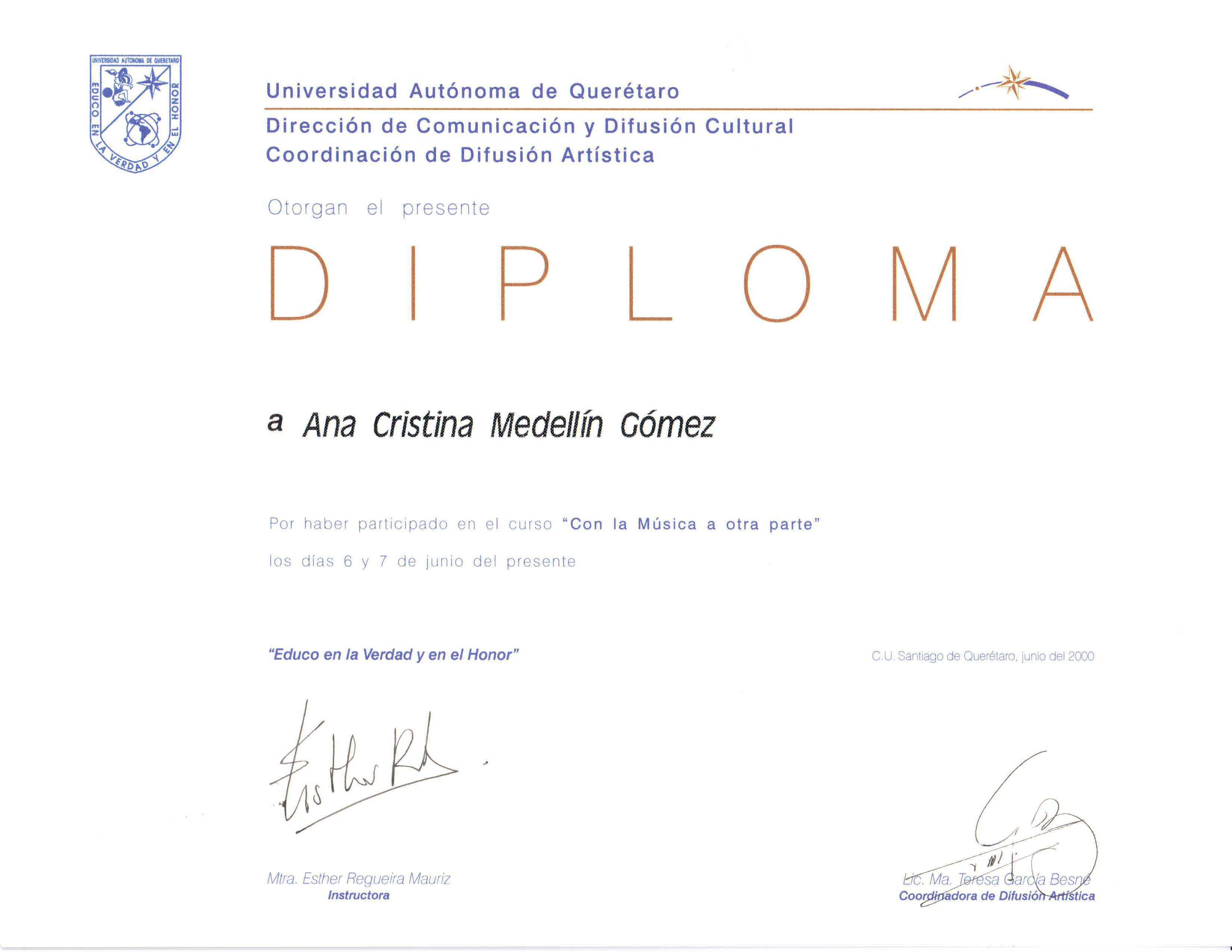 Ana Cristina Medellín Gómez, “Diploma por participar en curso "Con la Música a otra parte",” ReDCA-Grosso Modo, consulta 9 de marzo de 2026, http://redca.uaq.mx/grosso-modo/items/show/452.
