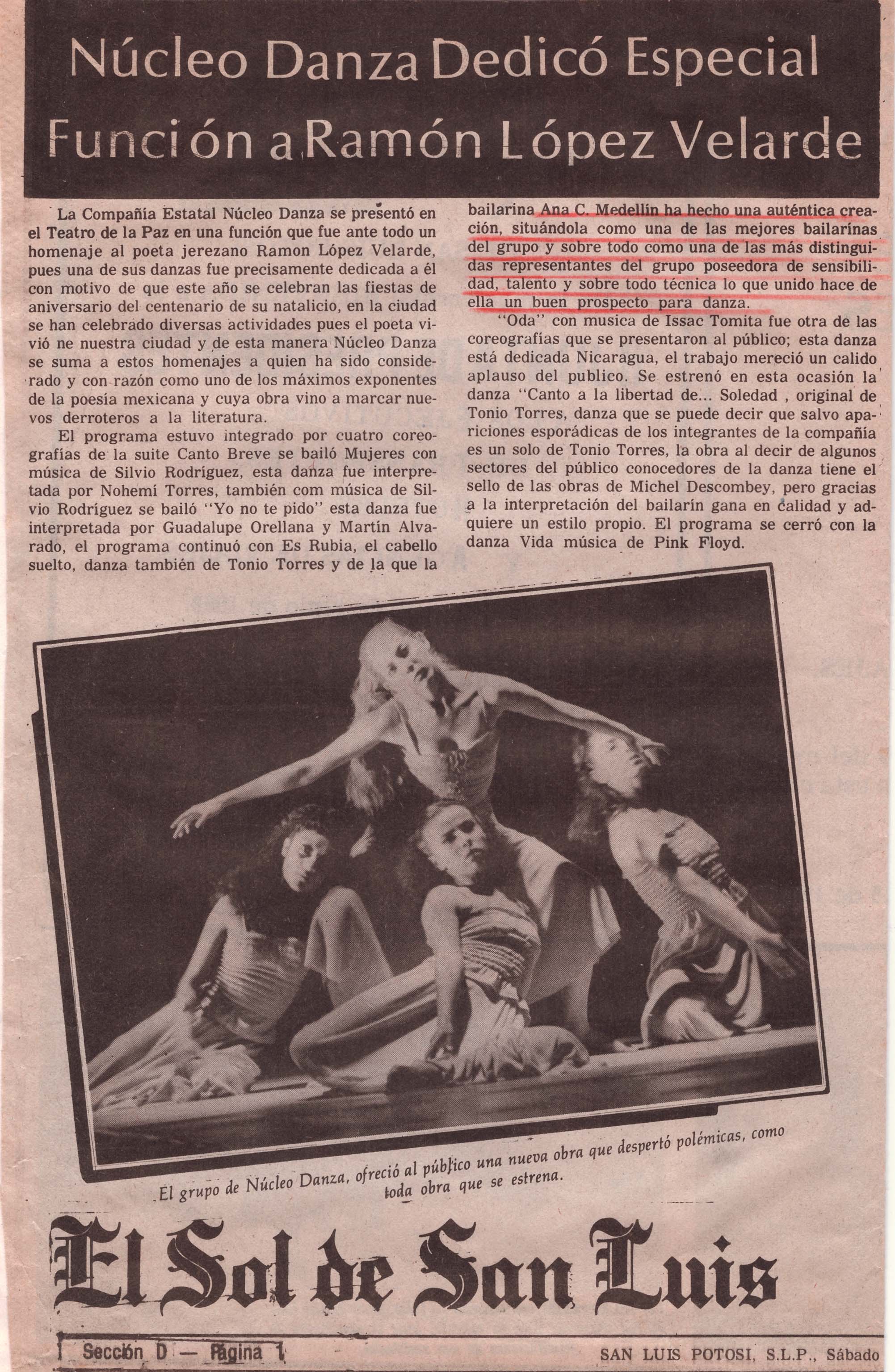 Nota sobre la función homenaje al poeta Ramón López Velarde, donde se hace mención y reconocimiento a la actuación de Cristina Medellín dentro del grupo de Núcleo Danza