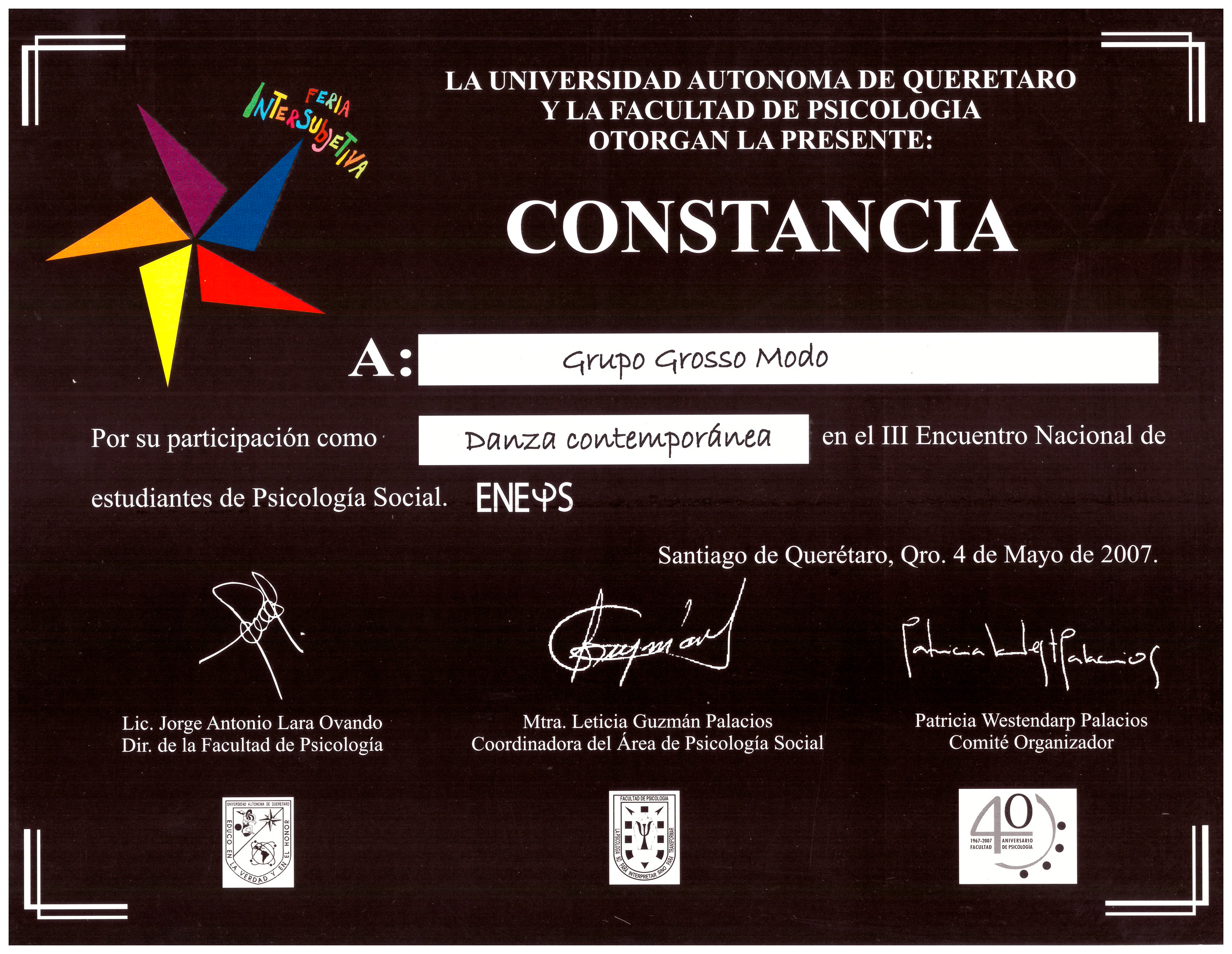Grosso Modo, “Reconocimiento por participación en el III Encuentro Nacional de estudiantes de Psicología Social con Danza Contemporánea,” ReDCA-Grosso Modo, consulta 9 de marzo de 2026, http://redca.uaq.mx/grosso-modo/items/show/70.